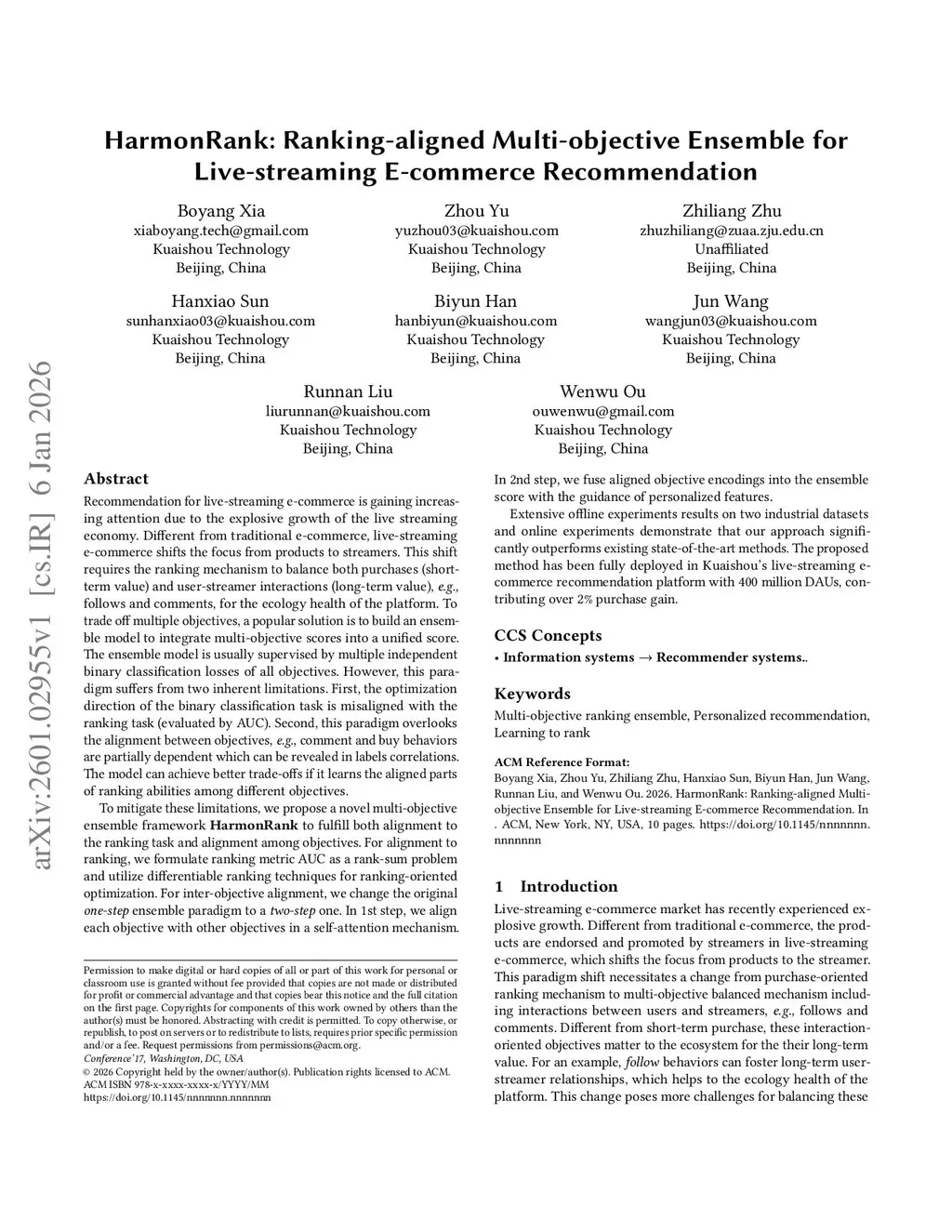 The industrial recommender systems always pursue more than one business goals. The inherent intensions between objectives pose significant challenges for ranking stage. A popular solution is to build a multi-objective ensemble (ME) model to integrate multi-objective predictions into a unified score. Although there have been some exploratory efforts, few work has yet been able to systematically delineate the core requirements of ME problem. We rethink ME problem from two perspectives. From the perspective of each individual objective, to achieve its maximum value the scores should be as consistent as possible with the ranks of its labels. From the perspective of entire set of objectives, an overall optimum can be achieved only when the scores align with the commonality shared by the majority of objectives. However, none of existing methods can meet these two requirements. To fill this gap, we propose a novel multi-objective ensemble framework HarmonRank to fulfill both requirements. For rank consistency, we formulate rank consistency (AUC) metric as a rank-sum problem and make the model optimized towards rank consistency in an end-to-end differentiable manner. For commonality modeling, we change the original relation-agnostic ensemble paradigm to a relation-aware one. Extensive offline experimental results on two industrial datasets and online experiments demonstrate that our approach significantly outperforms existing state-of-the-art methods. Besides, our method exhibits superior robustness to label skew situations which is common in industrial scenarios. The proposed method has been fully deployed in Kuaishou's live-streaming e-commerce recommendation platform with 400 million DAUs, contributing 2.6% purchase gain.