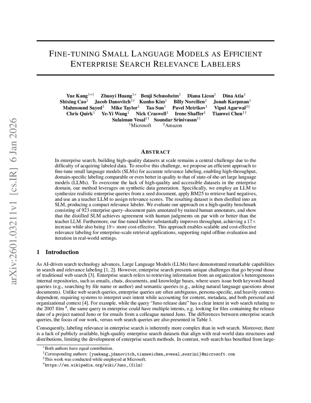 In enterprise search, building high-quality datasets at scale remains a central challenge due to the difficulty of acquiring labeled data. To resolve this challenge, we propose an efficient approach to fine-tune small language models (SLMs) for accurate relevance labeling, enabling high-throughput, domain-specific labeling comparable or even better in quality to that of state-of-the-art large language models (LLMs). To overcome the lack of high-quality and accessible datasets in the enterprise domain, our method leverages on synthetic data generation. Specifically, we employ an LLM to synthesize realistic enterprise queries from a seed document, apply BM25 to retrieve hard negatives, and use a teacher LLM to assign relevance scores. The resulting dataset is then distilled into an SLM, producing a compact relevance labeler. We evaluate our approach on a high-quality benchmark consisting of 923 enterprise query-document pairs annotated by trained human annotators, and show that the distilled SLM achieves agreement with human judgments on par with or better than the teacher LLM. Furthermore, our fine-tuned labeler substantially improves throughput, achieving 17 times increase while also being 19 times more cost-effective. This approach enables scalable and cost-effective relevance labeling for enterprise-scale retrieval applications, supporting rapid offline evaluation and iteration in real-world settings.