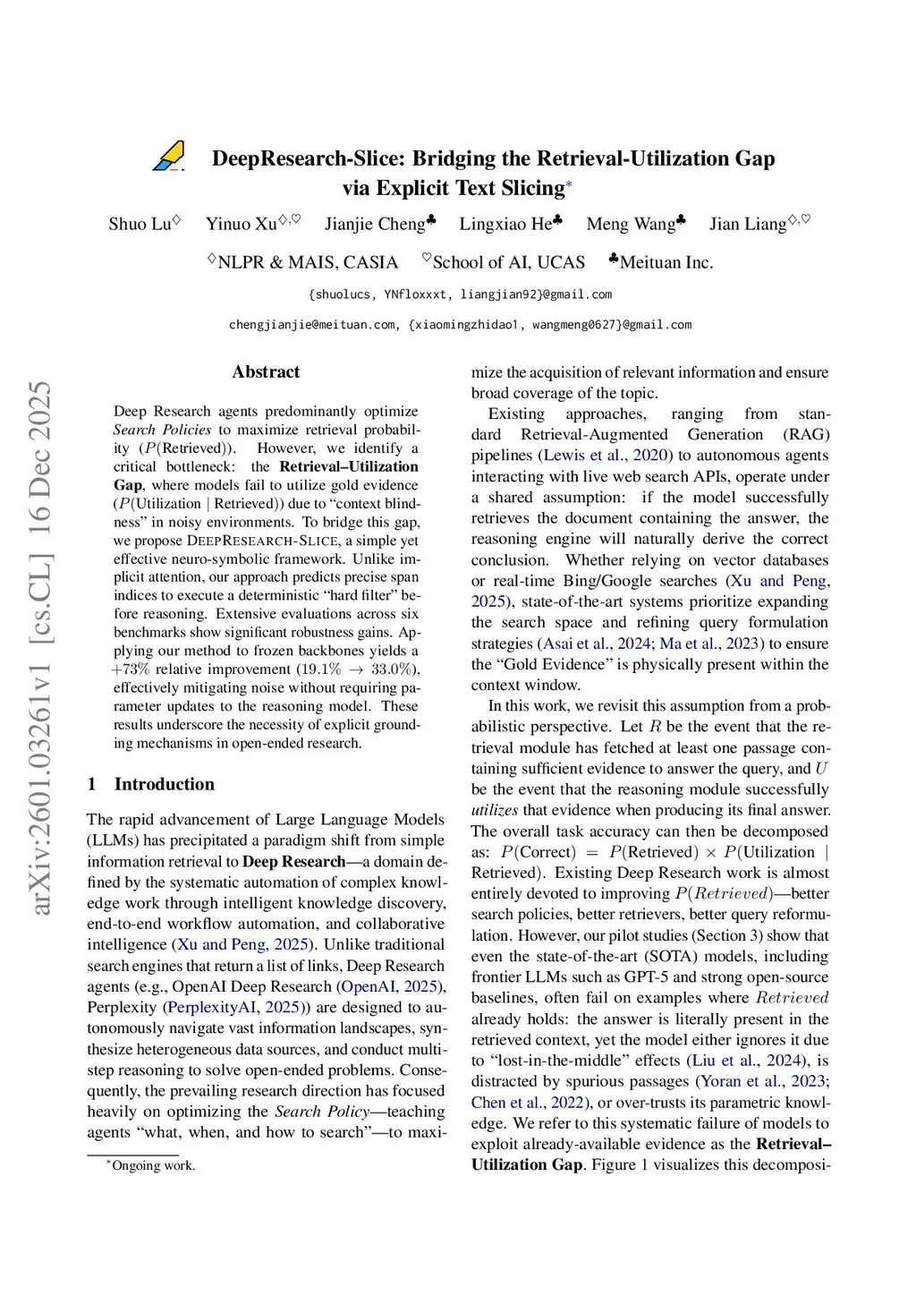 Deep Research agents predominantly optimize search policies to maximize retrieval probability. However, we identify a critical bottleneck: the retrieval-utilization gap, where models fail to use gold evidence even after it is retrieved, due to context blindness in noisy environments. To bridge this gap, we propose DeepResearch-Slice, a simple yet effective neuro-symbolic framework. Unlike implicit attention, our approach predicts precise span indices to perform a deterministic hard filter before reasoning. Extensive evaluations across six benchmarks show substantial robustness gains. Applying our method to frozen backbones yields a 73 percent relative improvement, from 19.1 percent to 33.0 percent, effectively mitigating noise without requiring parameter updates to the reasoning model. These results highlight the need for explicit grounding mechanisms in open-ended research.