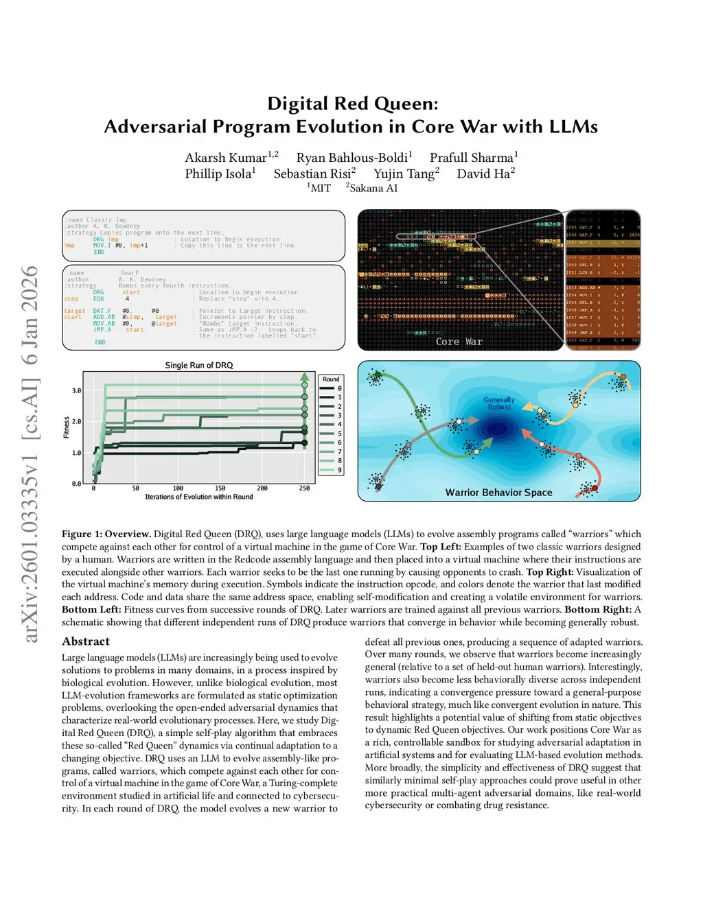 Large language models (LLMs) are increasingly being used to evolve solutions to problems in many domains, in a process inspired by biological evolution. However, unlike biological evolution, most LLM-evolution frameworks are formulated as static optimization problems, overlooking the open-ended adversarial dynamics that characterize real-world evolutionary processes. Here, we study Digital Red Queen (DRQ), a simple self-play algorithm that embraces these so-called "Red Queen" dynamics via continual adaptation to a changing objective. DRQ uses an LLM to evolve assembly-like programs, called warriors, which compete against each other for control of a virtual machine in the game of Core War, a Turing-complete environment studied in artificial life and connected to cybersecurity. In each round of DRQ, the model evolves a new warrior to defeat all previous ones, producing a sequence of adapted warriors. Over many rounds, we observe that warriors become increasingly general (relative to a set of held-out human warriors). Interestingly, warriors also become less behaviorally diverse across independent runs, indicating a convergence pressure toward a general-purpose behavioral strategy, much like convergent evolution in nature. This result highlights a potential value of shifting from static objectives to dynamic Red Queen objectives. Our work positions Core War as a rich, controllable sandbox for studying adversarial adaptation in artificial systems and for evaluating LLM-based evolution methods. More broadly, the simplicity and effectiveness of DRQ suggest that similarly minimal self-play approaches could prove useful in other more practical multi-agent adversarial domains, like real-world cybersecurity or combating drug resistance.