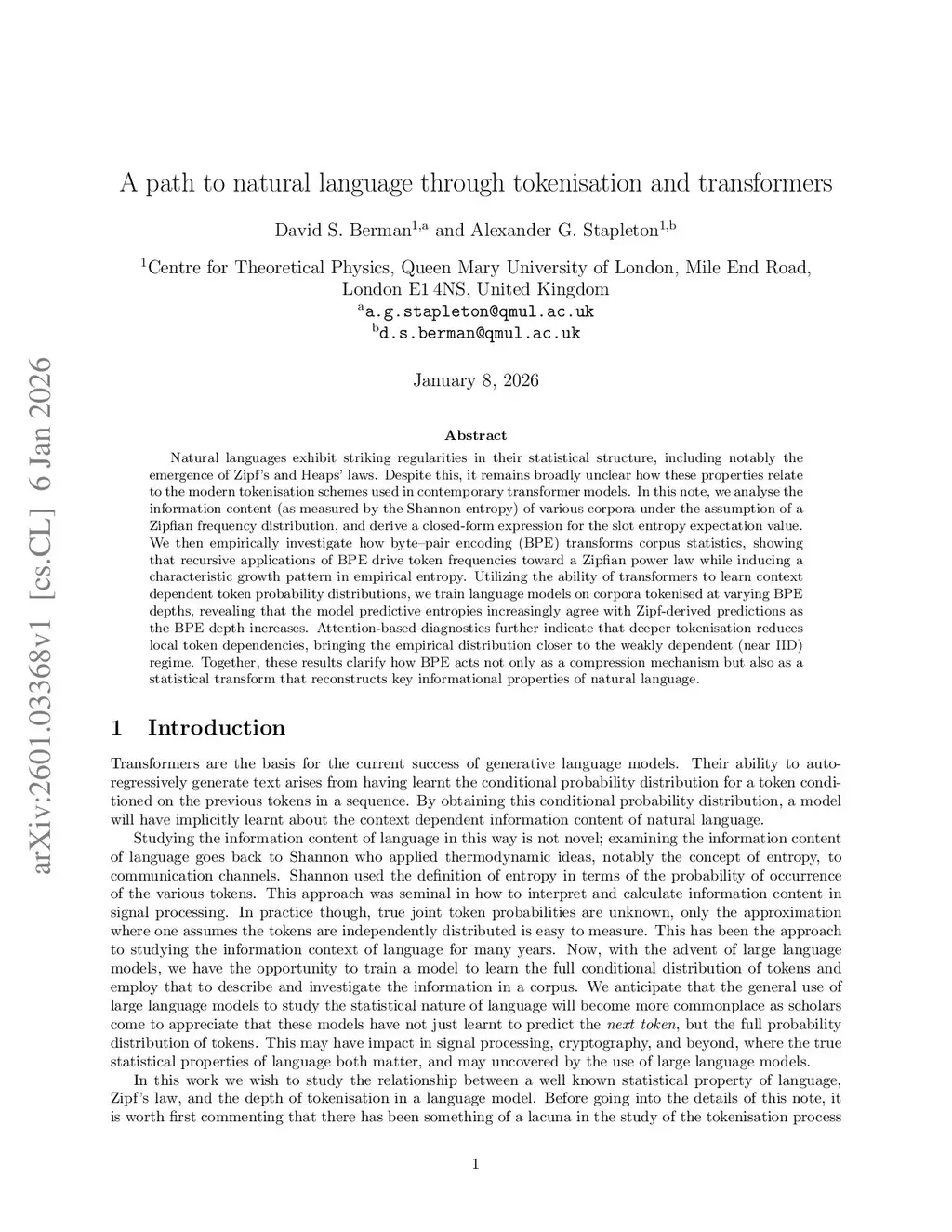 Natural languages exhibit striking regularities in their statistical structure, including notably the emergence of Zipf's and Heaps' laws. Despite this, it remains broadly unclear how these properties relate to the modern tokenisation schemes used in contemporary transformer models. In this note, we analyse the information content (as measured by the Shannon entropy) of various corpora under the assumption of a Zipfian frequency distribution, and derive a closed-form expression for the slot entropy expectation value. We then empirically investigate how byte--pair encoding (BPE) transforms corpus statistics, showing that recursive applications of BPE drive token frequencies toward a Zipfian power law while inducing a characteristic growth pattern in empirical entropy. Utilizing the ability of transformers to learn context dependent token probability distributions, we train language models on corpora tokenised at varying BPE depths, revealing that the model predictive entropies increasingly agree with Zipf-derived predictions as the BPE depth increases. Attention-based diagnostics further indicate that deeper tokenisation reduces local token dependencies, bringing the empirical distribution closer to the weakly dependent (near IID) regime. Together, these results clarify how BPE acts not only as a compression mechanism but also as a statistical transform that reconstructs key informational properties of natural language.