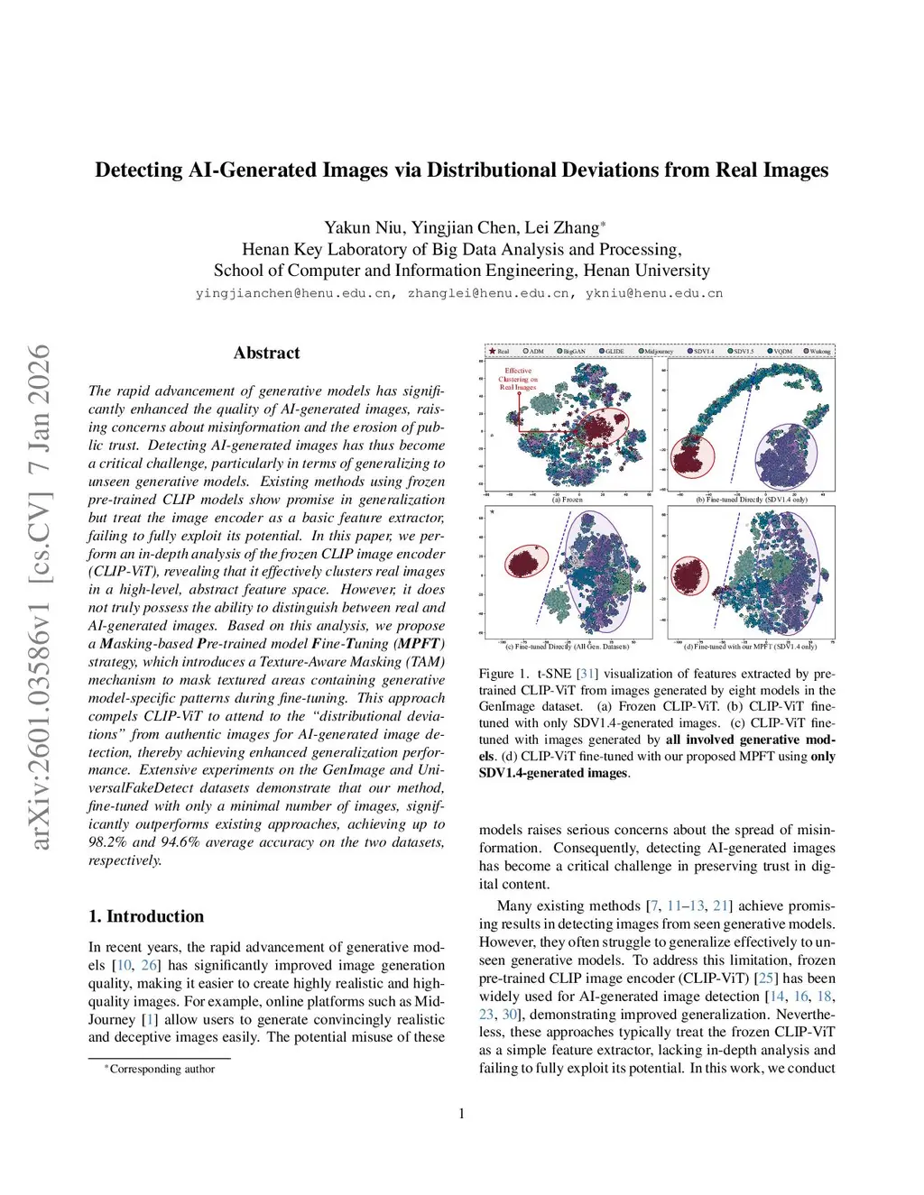 The rapid advancement of generative models has significantly enhanced the quality of AI-generated images, raising concerns about misinformation and the erosion of public trust. Detecting AI-generated images has thus become a critical challenge, particularly in terms of generalizing to unseen generative models. Existing methods using frozen pre-trained CLIP models show promise in generalization but treat the image encoder as a basic feature extractor, failing to fully exploit its potential. In this paper, we perform an in-depth analysis of the frozen CLIP image encoder (CLIP-ViT), revealing that it effectively clusters real images in a high-level, abstract feature space. However, it does not truly possess the ability to distinguish between real and AI-generated images. Based on this analysis, we propose a Masking-based Pre-trained model Fine-Tuning (MPFT) strategy, which introduces a Texture-Aware Masking (TAM) mechanism to mask textured areas containing generative model-specific patterns during fine-tuning. This approach compels CLIP-ViT to attend to the "distributional deviations"from authentic images for AI-generated image detection, thereby achieving enhanced generalization performance. Extensive experiments on the GenImage and UniversalFakeDetect datasets demonstrate that our method, fine-tuned with only a minimal number of images, significantly outperforms existing approaches, achieving up to 98.2% and 94.6% average accuracy on the two datasets, respectively.