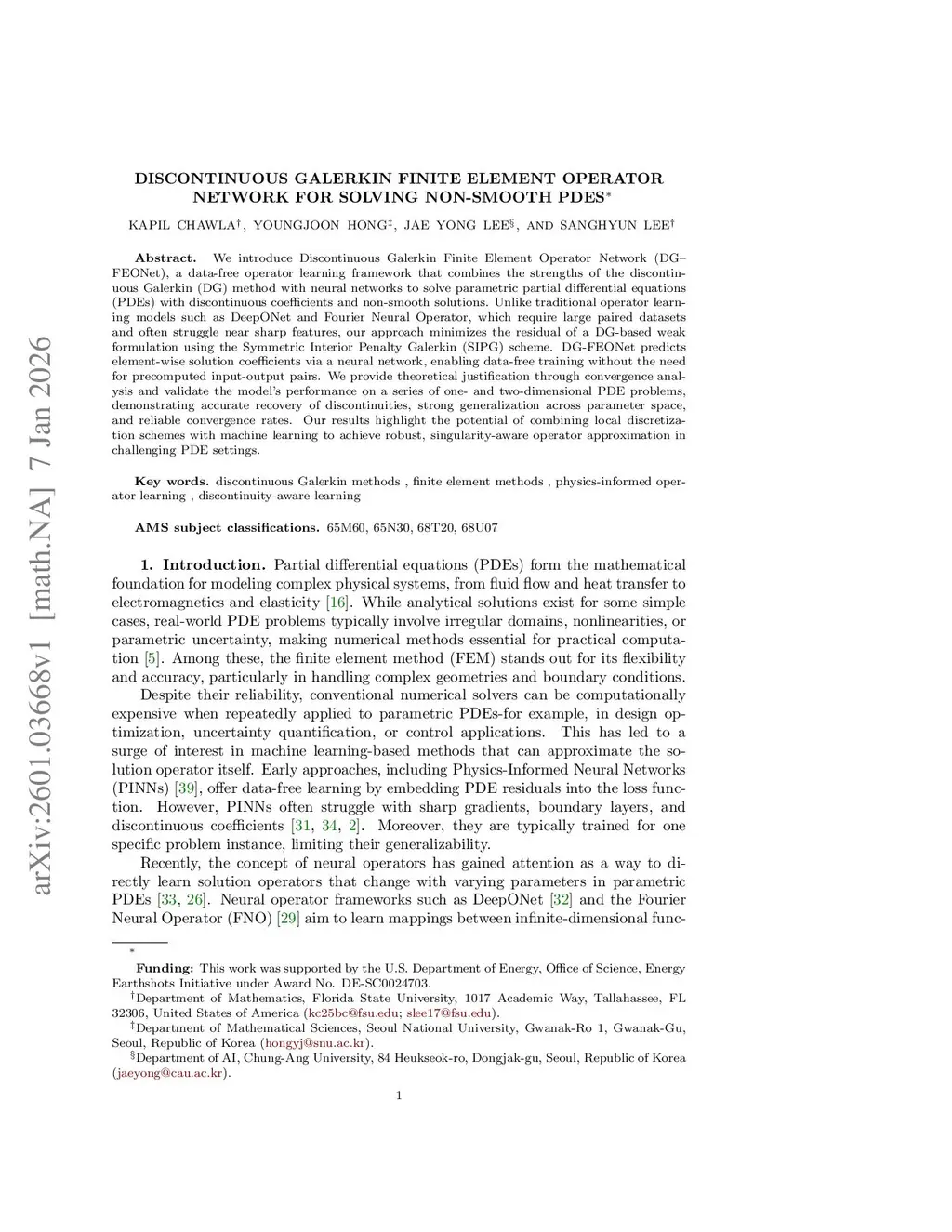 We introduce Discontinuous Galerkin Finite Element Operator Network (DG--FEONet), a data-free operator learning framework that combines the strengths of the discontinuous Galerkin (DG) method with neural networks to solve parametric partial differential equations (PDEs) with discontinuous coefficients and non-smooth solutions. Unlike traditional operator learning models such as DeepONet and Fourier Neural Operator, which require large paired datasets and often struggle near sharp features, our approach minimizes the residual of a DG-based weak formulation using the Symmetric Interior Penalty Galerkin (SIPG) scheme. DG-FEONet predicts element-wise solution coefficients via a neural network, enabling data-free training without the need for precomputed input-output pairs. We provide theoretical justification through convergence analysis and validate the model's performance on a series of one- and two-dimensional PDE problems, demonstrating accurate recovery of discontinuities, strong generalization across parameter space, and reliable convergence rates. Our results highlight the potential of combining local discretization schemes with machine learning to achieve robust, singularity-aware operator approximation in challenging PDE settings.