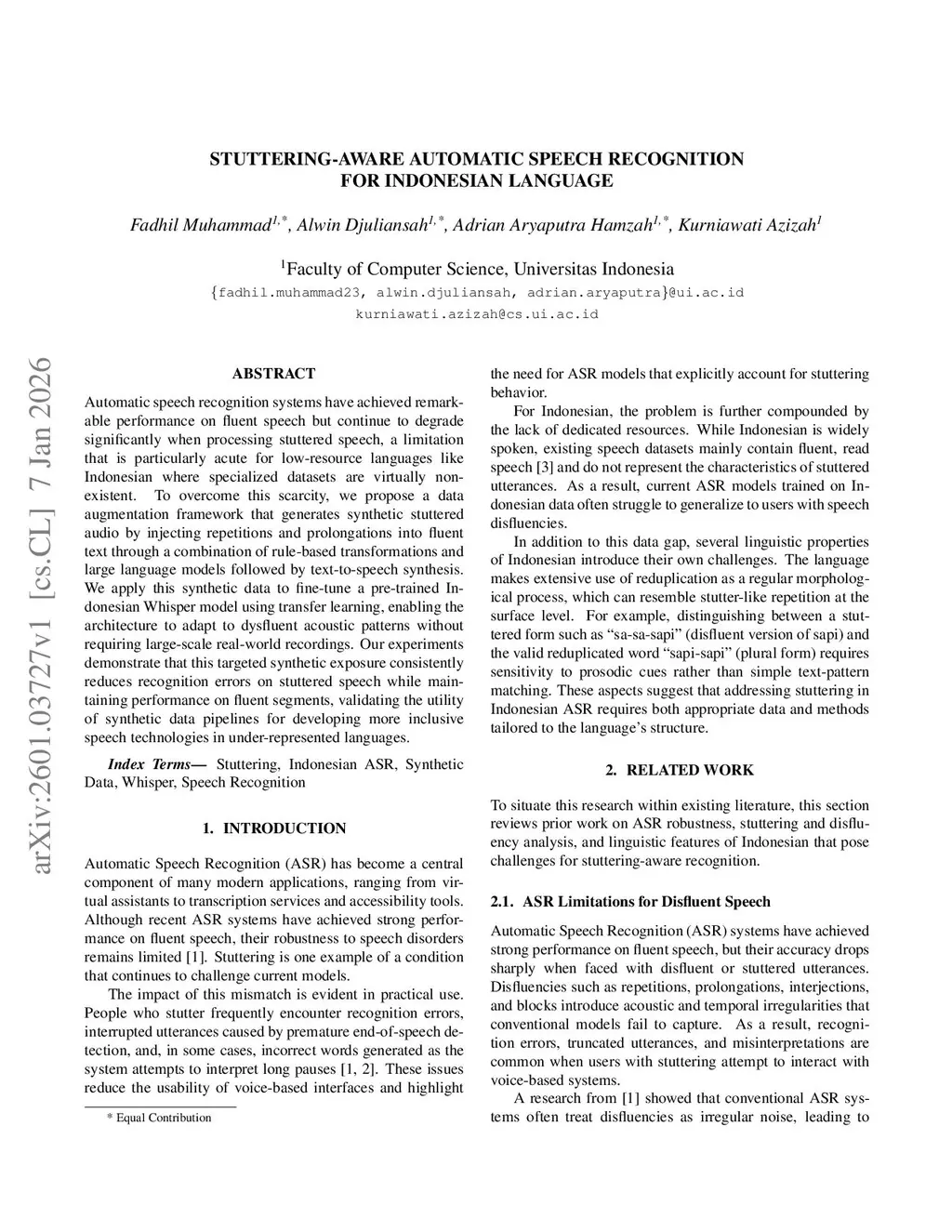 Automatic speech recognition systems have achieved remarkable performance on fluent speech but continue to degrade significantly when processing stuttered speech, a limitation that is particularly acute for low-resource languages like Indonesian where specialized datasets are virtually non-existent. To overcome this scarcity, we propose a data augmentation framework that generates synthetic stuttered audio by injecting repetitions and prolongations into fluent text through a combination of rule-based transformations and large language models followed by text-to-speech synthesis. We apply this synthetic data to fine-tune a pre-trained Indonesian Whisper model using transfer learning, enabling the architecture to adapt to dysfluent acoustic patterns without requiring large-scale real-world recordings. Our experiments demonstrate that this targeted synthetic exposure consistently reduces recognition errors on stuttered speech while maintaining performance on fluent segments, validating the utility of synthetic data pipelines for developing more inclusive speech technologies in under-represented languages.