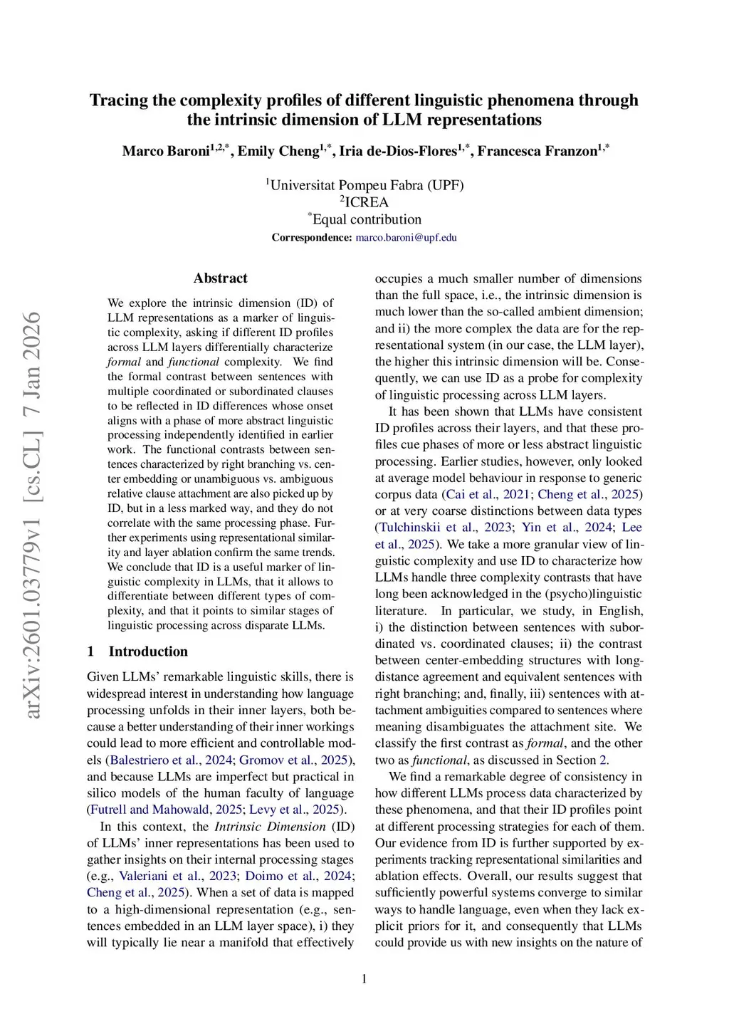 We explore the intrinsic dimension (ID) of LLM representations as a marker of linguistic complexity, asking if different ID profiles across LLM layers differentially characterize formal and functional complexity. We find the formal contrast between sentences with multiple coordinated or subordinated clauses to be reflected in ID differences whose onset aligns with a phase of more abstract linguistic processing independently identified in earlier work. The functional contrasts between sentences characterized by right branching vs. center embedding or unambiguous vs. ambiguous relative clause attachment are also picked up by ID, but in a less marked way, and they do not correlate with the same processing phase. Further experiments using representational similarity and layer ablation confirm the same trends. We conclude that ID is a useful marker of linguistic complexity in LLMs, that it allows to differentiate between different types of complexity, and that it points to similar stages of linguistic processing across disparate LLMs.
