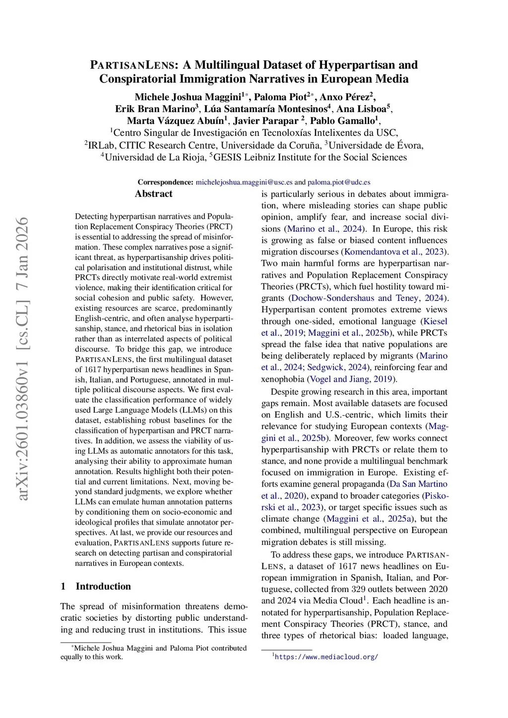 Detecting hyperpartisan narratives and Population Replacement Conspiracy Theories (PRCT) is essential to addressing the spread of misinformation. These complex narratives pose a significant threat, as hyperpartisanship drives political polarisation and institutional distrust, while PRCTs directly motivate real-world extremist violence, making their identification critical for social cohesion and public safety. However, existing resources are scarce, predominantly English-centric, and often analyse hyperpartisanship, stance, and rhetorical bias in isolation rather than as interrelated aspects of political discourse. To bridge this gap, we introduce \textsc{PartisanLens}, the first multilingual dataset of \num{1617} hyperpartisan news headlines in Spanish, Italian, and Portuguese, annotated in multiple political discourse aspects. We first evaluate the classification performance of widely used Large Language Models (LLMs) on this dataset, establishing robust baselines for the classification of hyperpartisan and PRCT narratives. In addition, we assess the viability of using LLMs as automatic annotators for this task, analysing their ability to approximate human annotation. Results highlight both their potential and current limitations. Next, moving beyond standard judgments, we explore whether LLMs can emulate human annotation patterns by conditioning them on socio-economic and ideological profiles that simulate annotator perspectives. At last, we provide our resources and evaluation, \textsc{PartisanLens} supports future research on detecting partisan and conspiratorial narratives in European contexts.