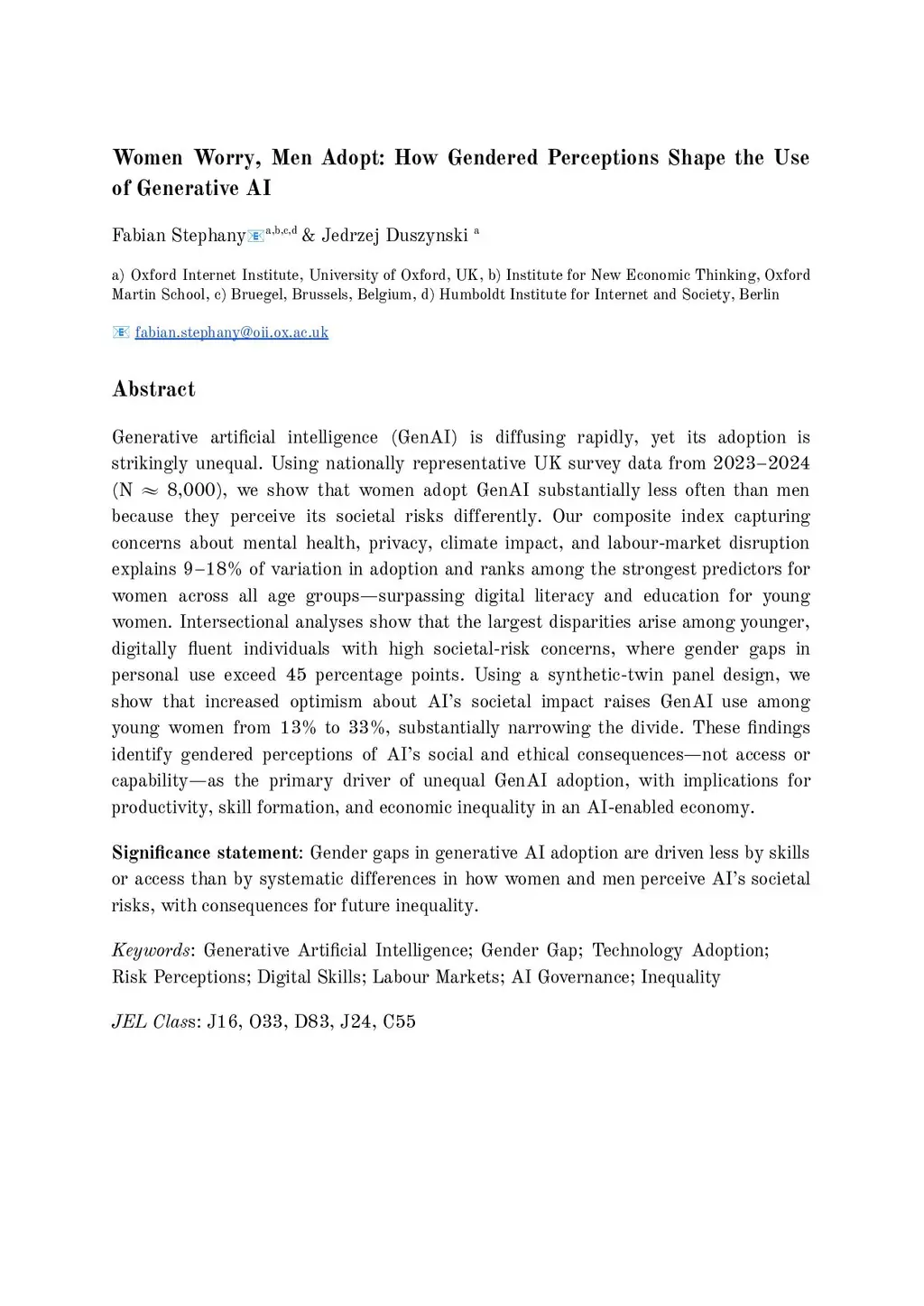 Generative artificial intelligence (GenAI) is diffusing rapidly, yet its adoption is strikingly unequal. Using nationally representative UK survey data from 2023 to 2024, we show that women adopt GenAI substantially less often than men because they perceive its societal risks differently. We construct a composite index capturing concerns about mental health, privacy, climate impact, and labor market disruption. This index explains between 9 and 18 percent of the variation in GenAI adoption and ranks among the strongest predictors for women across all age groups, surpassing digital literacy and education for young women. Intersectional analyses show that the largest disparities arise among younger, digitally fluent individuals with high societal risk concerns, where gender gaps in personal use exceed 45 percentage points. Using a synthetic twin panel design, we show that increased optimism about AI's societal impact raises GenAI use among young women from 13 percent to 33 percent, substantially narrowing the gender divide. These findings indicate that gendered perceptions of AI's social and ethical consequences, rather than access or capability, are the primary drivers of unequal GenAI adoption, with implications for productivity, skill formation, and economic inequality in an AI enabled economy.