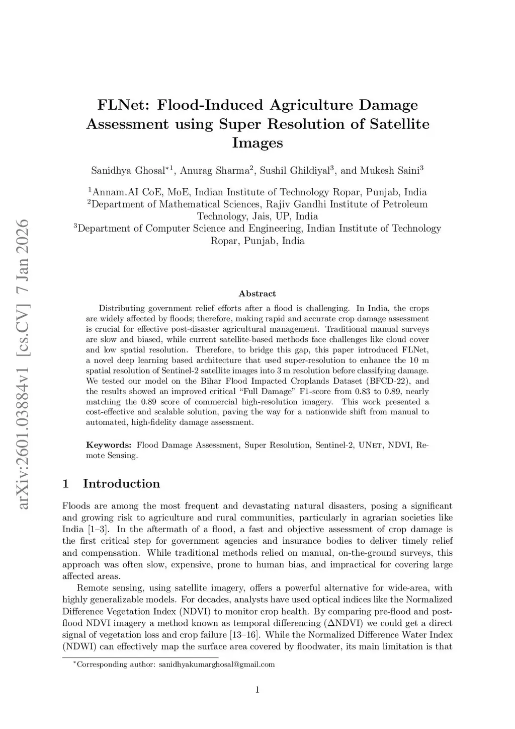 Distributing government relief efforts after a flood is challenging. In India, the crops are widely affected by floods; therefore, making rapid and accurate crop damage assessment is crucial for effective post-disaster agricultural management. Traditional manual surveys are slow and biased, while current satellite-based methods face challenges like cloud cover and low spatial resolution. Therefore, to bridge this gap, this paper introduced FLNet, a novel deep learning based architecture that used super-resolution to enhance the 10 m spatial resolution of Sentinel-2 satellite images into 3 m resolution before classifying damage. We tested our model on the Bihar Flood Impacted Croplands Dataset (BFCD-22), and the results showed an improved critical "Full Damage" F1-score from 0.83 to 0.89, nearly matching the 0.89 score of commercial high-resolution imagery. This work presented a cost-effective and scalable solution, paving the way for a nationwide shift from manual to automated, high-fidelity damage assessment.