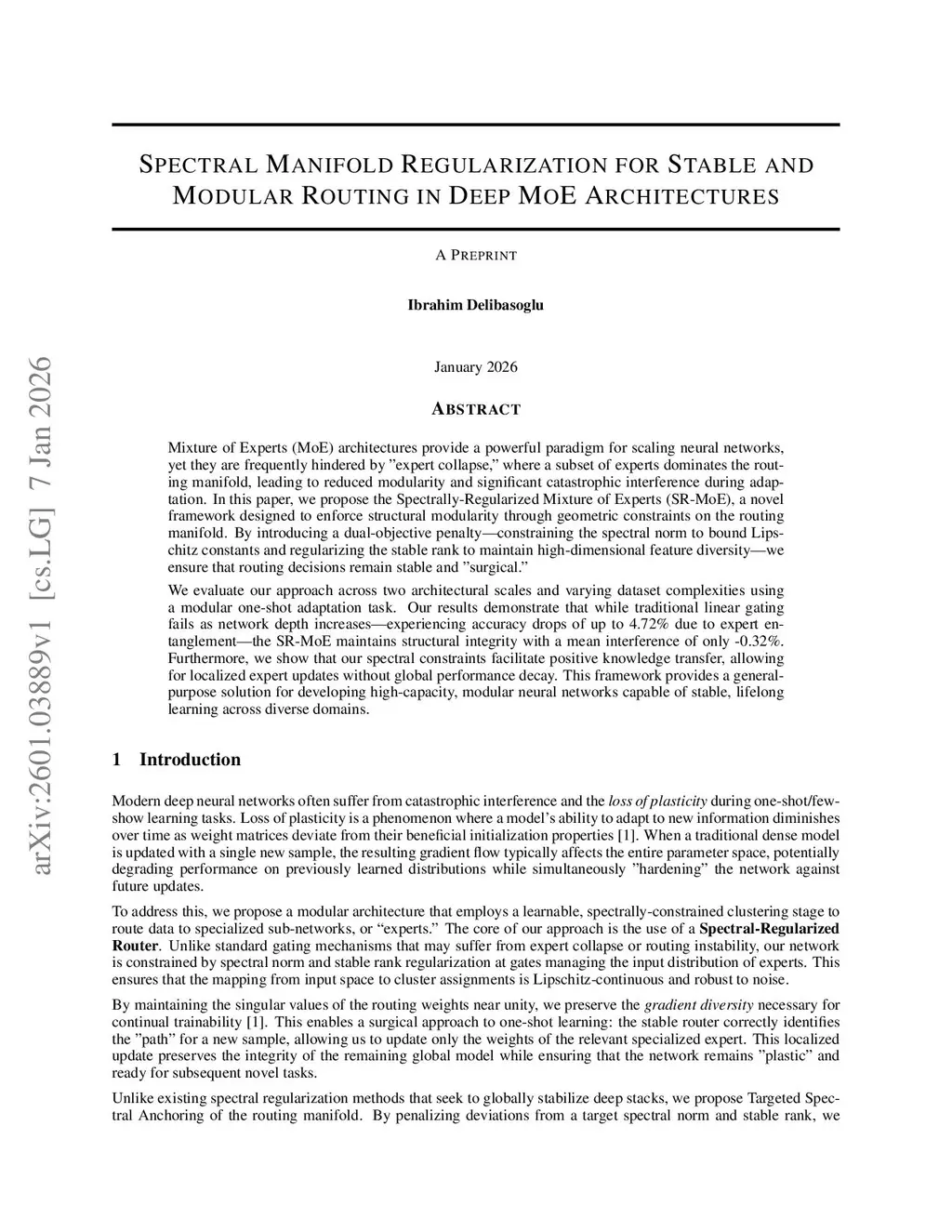 Mixture of Experts (MoE) architectures enable efficient scaling of neural networks but suffer from expert collapse, where routing converges to a few dominant experts. This reduces model capacity and causes catastrophic interference during adaptation. We propose the Spectrally-Regularized Mixture of Experts (SR-MoE), which imposes geometric constraints on the routing manifold to enforce structural modularity. Our method uses dual regularization: spectral norm constraints bound routing function Lipschitz continuity, while stable rank penalties preserve high-dimensional feature diversity in expert selection. We evaluate SR-MoE across architectural scales and dataset complexities using modular one-shot adaptation tasks. Results show that traditional linear gating fails with increasing depth (accuracy drops up to 4.72% due to expert entanglement), while SR-MoE maintains structural integrity (mean interference -0.32%). Our spectral constraints facilitate positive knowledge transfer, enabling localized expert updates without global performance decay. SR-MoE provides a general solution for building high-capacity, modular networks capable of stable lifelong learning.