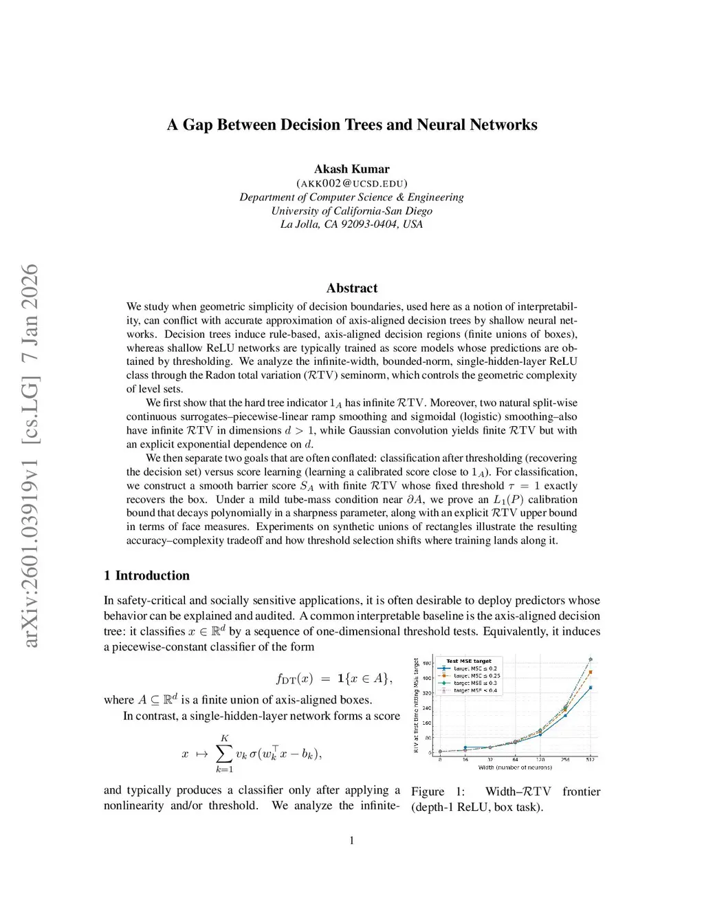 We study when geometric simplicity of decision boundaries, used here as a notion of interpretability, can conflict with accurate approximation of axis-aligned decision trees by shallow neural networks. Decision trees induce rule-based, axis-aligned decision regions (finite unions of boxes), whereas shallow ReLU networks are typically trained as score models whose predictions are obtained by thresholding. We analyze the infinite-width, bounded-norm, single-hidden-layer ReLU class through the Radon total variation () seminorm, which controls the geometric complexity of level sets.We first show that the hard tree indicator has infinite . Moreover, two natural split-wise continuous surrogates--piecewise-linear ramp smoothing and sigmoidal (logistic) smoothing--also have infinite in dimensions , while Gaussian convolution yields finite but with an explicit exponential dependence on .We then separate two goals that are often conflated: classification after thresholding (recovering the decision set) versus score learning (learning a calibrated score close to ). For classification, we construct a smooth barrier score with finite whose fixed threshold exactly recovers the box. Under a mild tube-mass condition near , we prove an calibration bound that decays polynomially in a sharpness parameter, along with an explicit upper bound in terms of face measures. Experiments on synthetic unions of rectangles illustrate the resulting accuracy--complexity tradeoff and how threshold selection shifts where training lands along it.