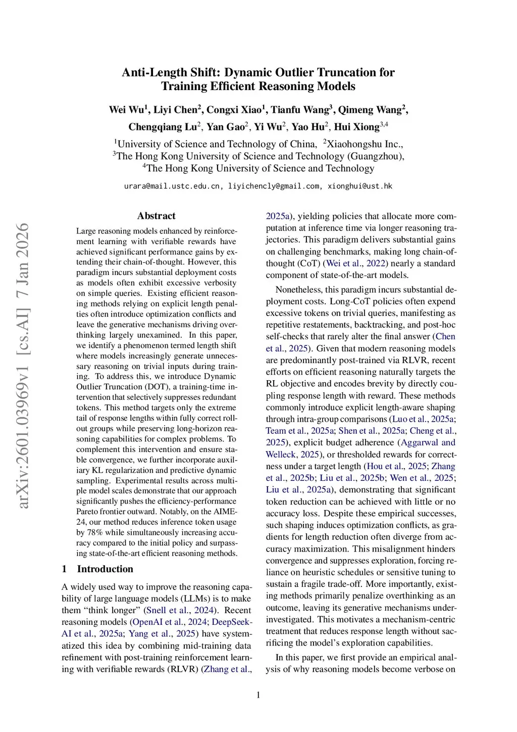 Large reasoning models enhanced by reinforcement learning with verifiable rewards have achieved significant performance gains by extending their chain-of-thought. However, this paradigm incurs substantial deployment costs as models often exhibit excessive verbosity on simple queries. Existing efficient reasoning methods relying on explicit length penalties often introduce optimization conflicts and leave the generative mechanisms driving overthinking largely unexamined. In this paper, we identify a phenomenon termed length shift where models increasingly generate unnecessary reasoning on trivial inputs during training. To address this, we introduce Dynamic Outlier Truncation (DOT), a training-time intervention that selectively suppresses redundant tokens. This method targets only the extreme tail of response lengths within fully correct rollout groups while preserving long-horizon reasoning capabilities for complex problems. To complement this intervention and ensure stable convergence, we further incorporate auxiliary KL regularization and predictive dynamic sampling. Experimental results across multiple model scales demonstrate that our approach significantly pushes the efficiency-performance Pareto frontier outward. Notably, on the AIME-24, our method reduces inference token usage by 78% while simultaneously increasing accuracy compared to the initial policy and surpassing state-of-the-art efficient reasoning methods.