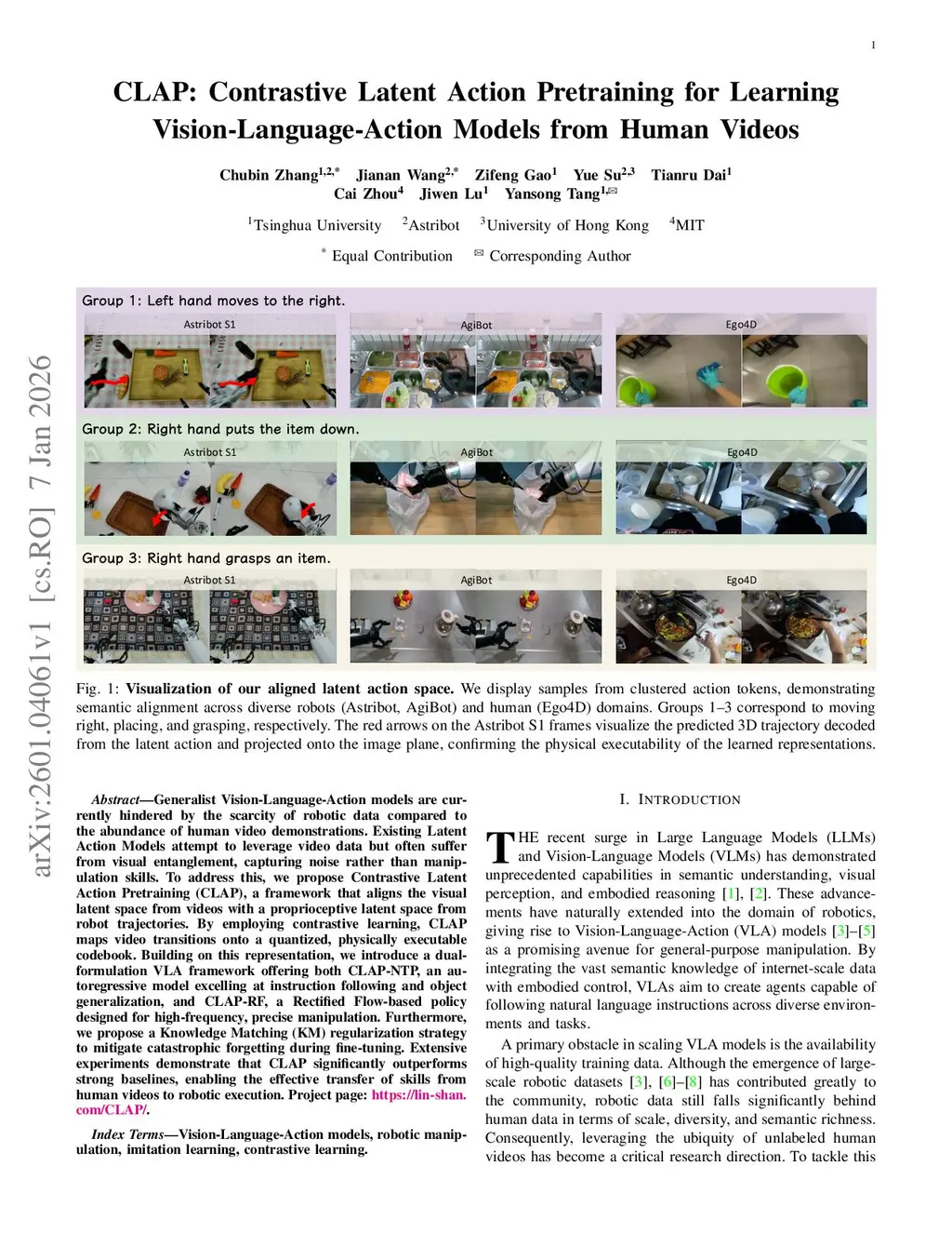 Generalist Vision-Language-Action models are currently hindered by the scarcity of robotic data compared to the abundance of human video demonstrations. Existing Latent Action Models attempt to leverage video data but often suffer from visual entanglement, capturing noise rather than manipulation skills. To address this, we propose Contrastive Latent Action Pretraining (CLAP), a framework that aligns the visual latent space from videos with a proprioceptive latent space from robot trajectories. By employing contrastive learning, CLAP maps video transitions onto a quantized, physically executable codebook. Building on this representation, we introduce a dual-formulation VLA framework offering both CLAP-NTP, an autoregressive model excelling at instruction following and object generalization, and CLAP-RF, a Rectified Flow-based policy designed for high-frequency, precise manipulation. Furthermore, we propose a Knowledge Matching (KM) regularization strategy to mitigate catastrophic forgetting during fine-tuning. Extensive experiments demonstrate that CLAP significantly outperforms strong baselines, enabling the effective transfer of skills from human videos to robotic execution. Project page:this https URL.