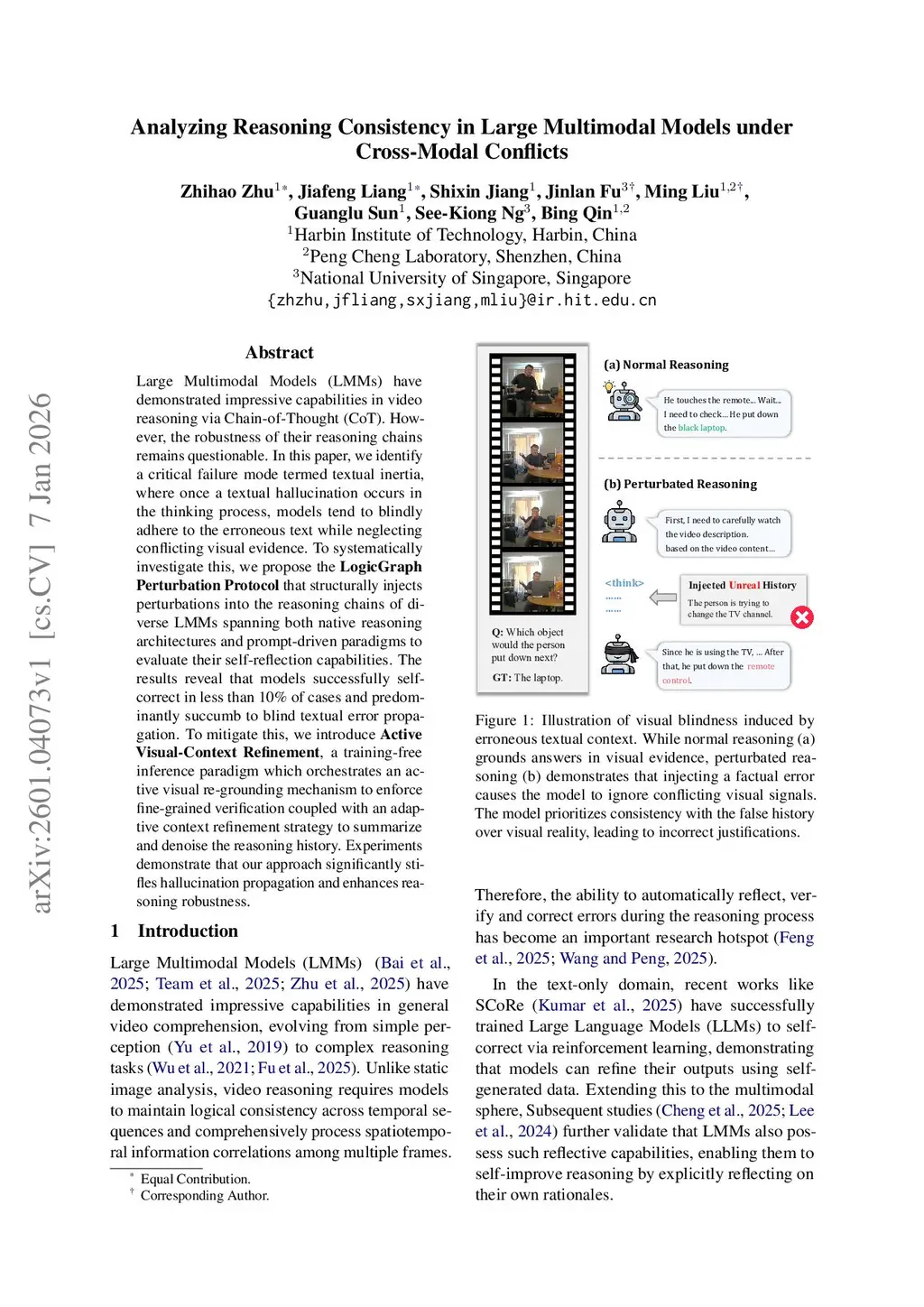 Large Multimodal Models (LMMs) have demonstrated impressive capabilities in video reasoning via Chain-of-Thought (CoT). However, the robustness of their reasoning chains remains questionable. In this paper, we identify a critical failure mode termed textual inertia, where once a textual hallucination occurs in the thinking process, models tend to blindly adhere to the erroneous text while neglecting conflicting visual evidence. To systematically investigate this, we propose the LogicGraph Perturbation Protocol that structurally injects perturbations into the reasoning chains of diverse LMMs spanning both native reasoning architectures and prompt-driven paradigms to evaluate their self-reflection capabilities. The results reveal that models successfully self-correct in less than 10% of cases and predominantly succumb to blind textual error propagation. To mitigate this, we introduce Active Visual-Context Refinement, a training-free inference paradigm which orchestrates an active visual re-grounding mechanism to enforce fine-grained verification coupled with an adaptive context refinement strategy to summarize and denoise the reasoning history. Experiments demonstrate that our approach significantly stifles hallucination propagation and enhances reasoning robustness.