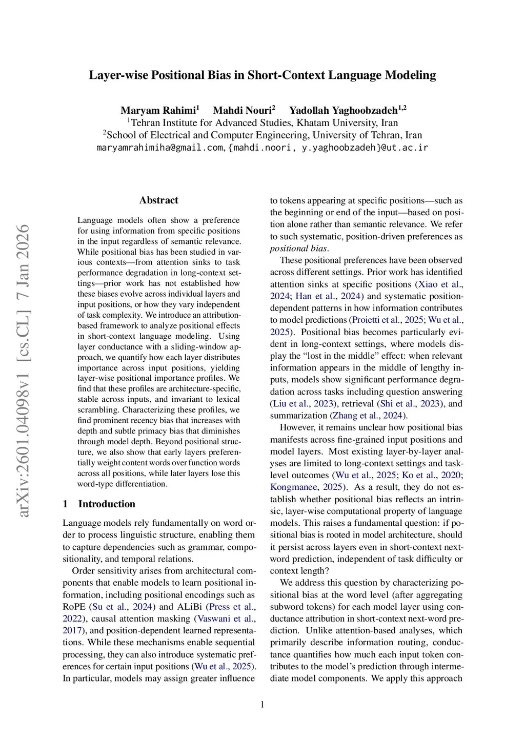 Language models often show a preference for using information from specific positions in the input regardless of semantic relevance. While positional bias has been studied in various contexts, from attention sinks to task performance degradation in long-context settings, prior work has not established how these biases evolve across individual layers and input positions, or how they vary independent of task complexity. We introduce an attribution-based framework to analyze positional effects in short-context language modeling. Using layer conductance with a sliding-window approach, we quantify how each layer distributes importance across input positions, yielding layer-wise positional importance profiles. We find that these profiles are architecture-specific, stable across inputs, and invariant to lexical scrambling. Characterizing these profiles, we find prominent recency bias that increases with depth and subtle primacy bias that diminishes through model depth. Beyond positional structure, we also show that early layers preferentially weight content words over function words across all positions, while later layers lose this word-type differentiation.