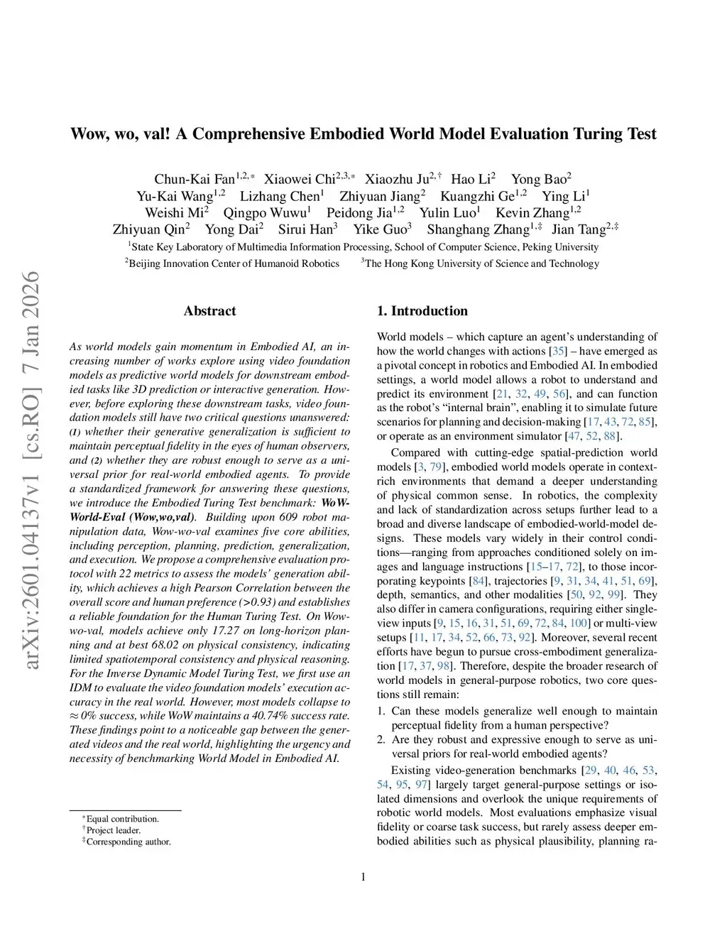 As world models gain momentum in Embodied AI, an increasing number of works explore using video foundation models as predictive world models for downstream embodied tasks like 3D prediction or interactive generation. However, before exploring these downstream tasks, video foundation models still have two critical questions unanswered: (1) whether their generative generalization is sufficient to maintain perceptual fidelity in the eyes of human observers, and (2) whether they are robust enough to serve as a universal prior for real-world embodied agents. To provide a standardized framework for answering these questions, we introduce the Embodied Turing Test benchmark: WoW-World-Eval (Wow,wo,val). Building upon 609 robot manipulation data, Wow-wo-val examines five core abilities, including perception, planning, prediction, generalization, and execution. We propose a comprehensive evaluation protocol with 22 metrics to assess the models' generation ability, which achieves a high Pearson Correlation between the overall score and human preference (>0.93) and establishes a reliable foundation for the Human Turing Test. On Wow-wo-val, models achieve only 17.27 on long-horizon planning and at best 68.02 on physical consistency, indicating limited spatiotemporal consistency and physical reasoning. For the Inverse Dynamic Model Turing Test, we first use an IDM to evaluate the video foundation models' execution accuracy in the real world. However, most models collapse to 0% success, while WoW maintains a 40.74% success rate. These findings point to a noticeable gap between the generated videos and the real world, highlighting the urgency and necessity of benchmarking World Model in Embodied AI.