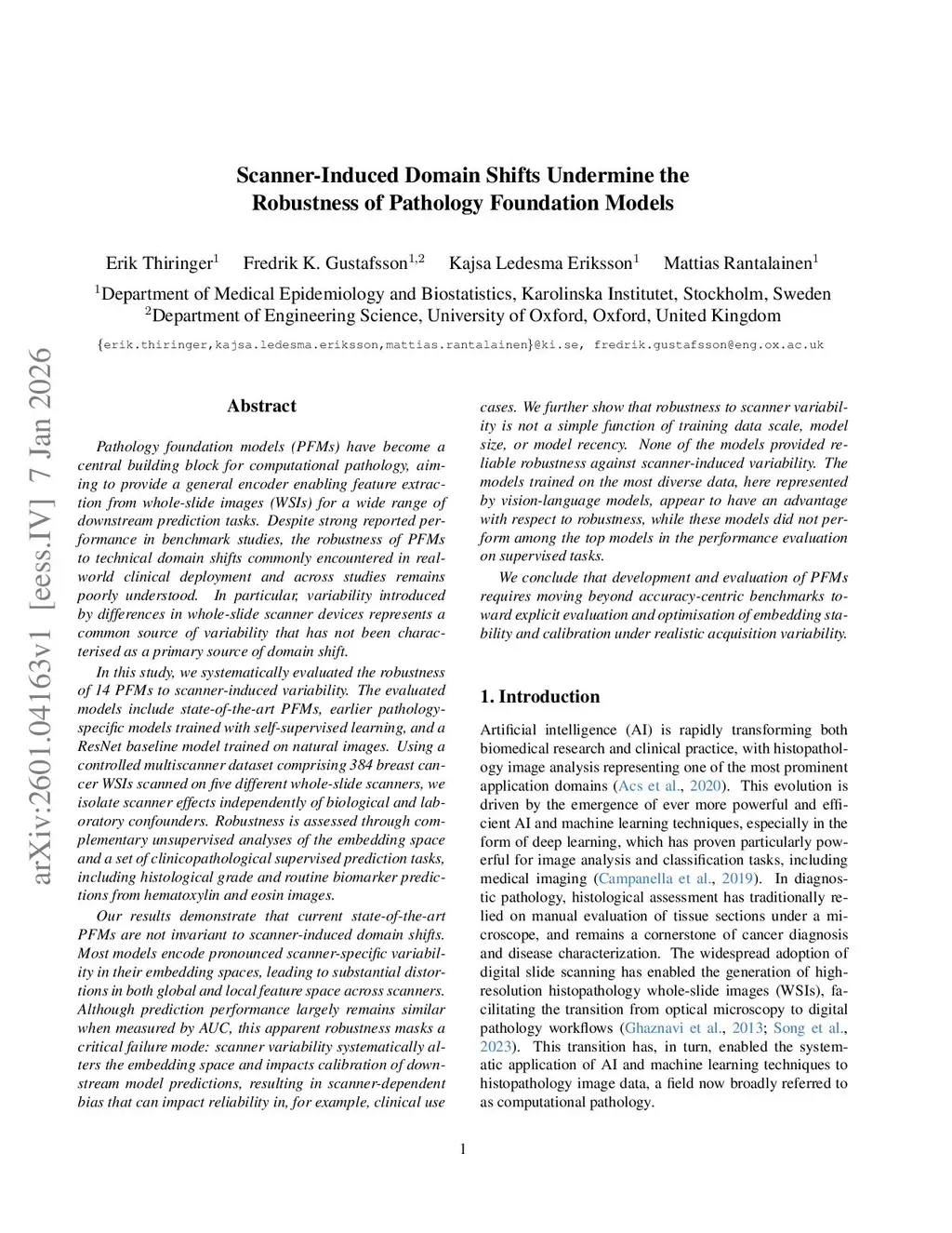 Pathology foundation models (PFMs) have become central to computational pathology, aiming to offer general encoders for feature extraction from whole-slide images (WSIs). Despite strong benchmark performance, PFM robustness to real-world technical domain shifts, such as variability from whole-slide scanner devices, remains poorly understood. We systematically evaluated the robustness of 14 PFMs to scanner-induced variability, including state-of-the-art models, earlier self-supervised models, and a baseline trained on natural images. Using a multiscanner dataset of 384 breast cancer WSIs scanned on five devices, we isolated scanner effects independently from biological and laboratory confounders. Robustness is assessed via complementary unsupervised embedding analyses and a set of clinicopathological supervised prediction tasks. Our results demonstrate that current PFMs are not invariant to scanner-induced domain shifts. Most models encode pronounced scanner-specific variability in their embedding spaces. While AUC often remains stable, this masks a critical failure mode: scanner variability systematically alters the embedding space and impacts calibration of downstream model predictions, resulting in scanner-dependent bias that can impact reliability in clinical use cases. We further show that robustness is not a simple function of training data scale, model size, or model recency. None of the models provided reliable robustness against scanner-induced variability. While the models trained on the most diverse data, here represented by vision-language models, appear to have an advantage with respect to robustness, they underperformed on downstream supervised tasks. We conclude that development and evaluation of PFMs requires moving beyond accuracy-centric benchmarks toward explicit evaluation and optimisation of embedding stability and calibration under realistic acquisition variability.