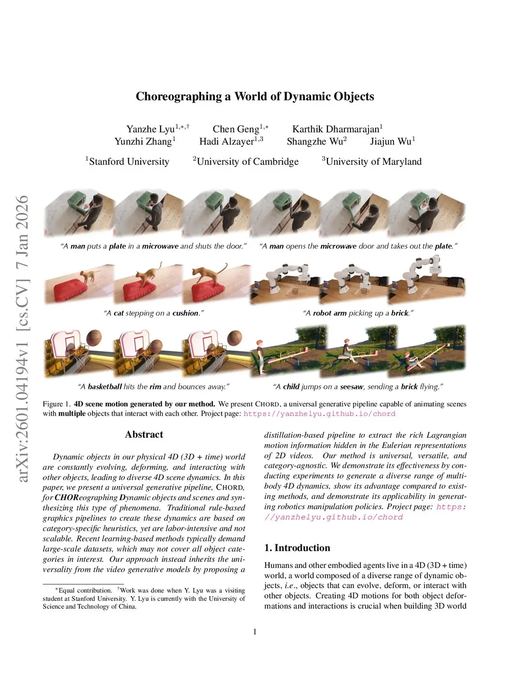 Dynamic objects in our physical 4D (3D + time) world are constantly evolving, deforming, and interacting with other objects, leading to diverse 4D scene dynamics. In this paper, we present a universal generative pipeline, CHORD, for CHOReographing Dynamic objects and scenes and synthesizing this type of phenomena. Traditional rule-based graphics pipelines to create these dynamics are based on category-specific heuristics, yet are labor-intensive and not scalable. Recent learning-based methods typically demand large-scale datasets, which may not cover all object categories in interest. Our approach instead inherits the universality from the video generative models by proposing a distillation-based pipeline to extract the rich Lagrangian motion information hidden in the Eulerian representations of 2D videos. Our method is universal, versatile, and category-agnostic. We demonstrate its effectiveness by conducting experiments to generate a diverse range of multi-body 4D dynamics, show its advantage compared to existing methods, and demonstrate its applicability in generating robotics manipulation policies. Project page:this https URL