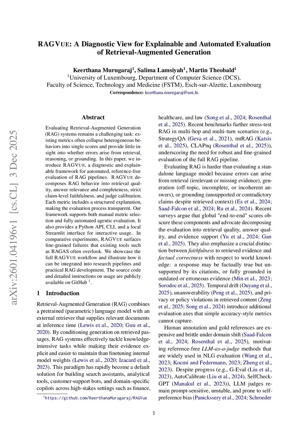 Evaluating Retrieval-Augmented Generation (RAG) systems remains a challenging task: existing metrics often collapse heterogeneous behaviors into single scores and provide little insight into whether errors arise from retrieval,reasoning, or grounding. In this paper, we introduce RAGVUE, a diagnostic and explainable framework for automated, reference-free evaluation of RAG pipelines. RAGVUE decomposes RAG behavior into retrieval quality, answer relevance and completeness, strict claim-level faithfulness, and judge calibration. Each metric includes a structured explanation, making the evaluation process transparent. Our framework supports both manual metric selection and fully automated agentic evaluation. It also provides a Python API, CLI, and a local Streamlit interface for interactive usage. In comparative experiments, RAGVUE surfaces fine-grained failures that existing tools such as RAGAS often overlook. We showcase the full RAGVUE workflow and illustrate how it can be integrated into research pipelines and practical RAG development. The source code and detailed instructions on usage are publicly available on GitHub