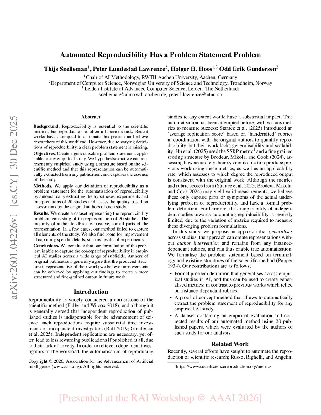 Background. Reproducibility is essential to the scientific method, but reproduction is often a laborious task. Recent works have attempted to automate this process and relieve researchers of this workload. However, due to varying definitions of reproducibility, a clear problem statement is missing. Objectives. Create a generalisable problem statement, applicable to any empirical study. We hypothesise that we can represent any empirical study using a structure based on the scientific method and that this representation can be automatically extracted from any publication, and captures the essence of the study. Methods. We apply our definition of reproducibility as a problem statement for the automatisation of reproducibility by automatically extracting the hypotheses, experiments and interpretations of 20 studies and assess the quality based on assessments by the original authors of each study. Results. We create a dataset representing the reproducibility problem, consisting of the representation of 20 studies. The majority of author feedback is positive, for all parts of the representation. In a few cases, our method failed to capture all elements of the study. We also find room for improvement at capturing specific details, such as results of experiments. Conclusions. We conclude that our formulation of the problem is able to capture the concept of reproducibility in empirical AI studies across a wide range of subfields. Authors of original publications generally agree that the produced structure is representative of their work; we believe improvements can be achieved by applying our findings to create a more structured and fine-grained output in future work.