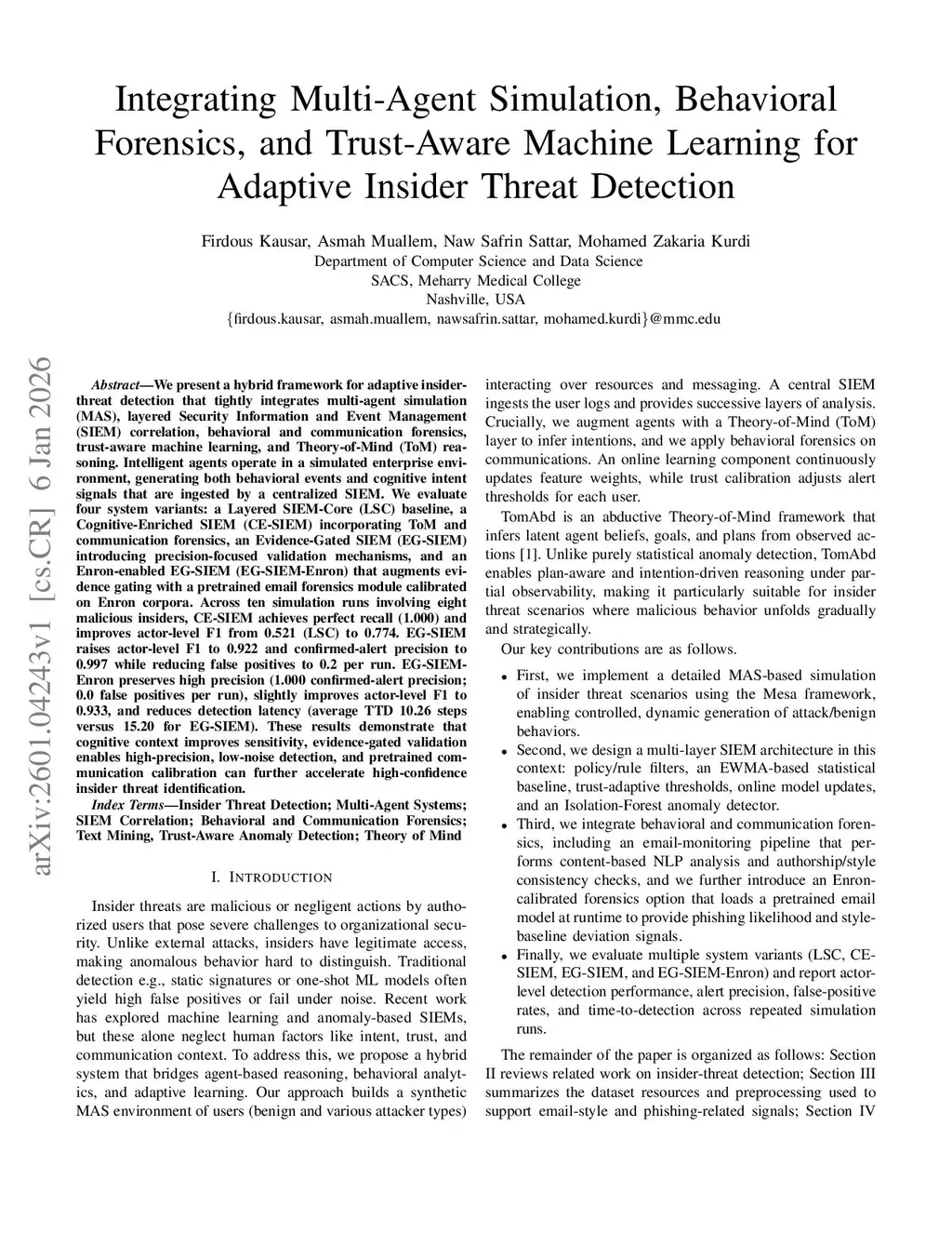 We present a hybrid framework for adaptive insider-threat detection that tightly integrates multi-agent simulation (MAS), layered Security Information and Event Management (SIEM) correlation, behavioral and communication forensics, trust-aware machine learning, and Theory-of-Mind (ToM) reasoning. Intelligent agents operate in a simulated enterprise environment, generating both behavioral events and cognitive intent signals that are ingested by a centralized SIEM. We evaluate four system variants: a Layered SIEM-Core (LSC) baseline, a Cognitive-Enriched SIEM (CE-SIEM) incorporating ToM and communication forensics, an Evidence-Gated SIEM (EG-SIEM) introducing precision-focused validation mechanisms, and an Enron-enabled EG-SIEM (EG-SIEM-Enron) that augments evidence gating with a pretrained email forensics module calibrated on Enron corpora. Across ten simulation runs involving eight malicious insiders, CE-SIEM achieves perfect recall (1.000) and improves actor-level F1 from 0.521 (LSC) to 0.774. EG-SIEM raises actor-level F1 to 0.922 and confirmed-alert precision to 0.997 while reducing false positives to 0.2 per run. EG-SIEM-Enron preserves high precision (1.000 confirmed-alert precision; 0.0 false positives per run), slightly improves actor-level F1 to 0.933, and reduces detection latency (average TTD 10.26 steps versus 15.20 for EG-SIEM). These results demonstrate that cognitive context improves sensitivity, evidence-gated validation enables high-precision, low-noise detection, and pretrained communication calibration can further accelerate high-confidence insider threat identification.