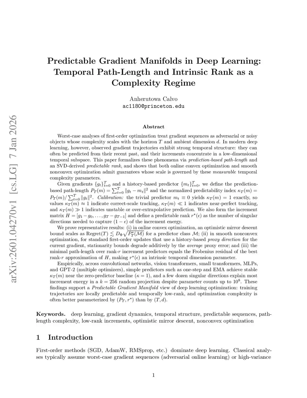 Predictable Gradient Manifolds in Deep Learning: Temporal Path-Length and Intrinsic Rank as a Complexity Regime