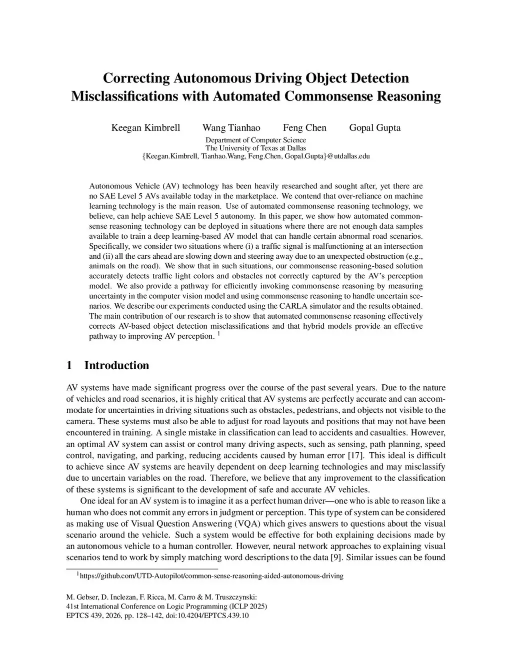 Autonomous Vehicle (AV) technology has been heavily researched and sought after, yet there are no SAE Level 5 AVs available today in the marketplace. We contend that over-reliance on machine learning technology is the main reason. Use of automated commonsense reasoning technology, we believe, can help achieve SAE Level 5 autonomy. In this paper, we show how automated common- sense reasoning technology can be deployed in situations where there are not enough data samples available to train a deep learning-based AV model that can handle certain abnormal road scenarios. Specifically, we consider two situations where (i) a traffic signal is malfunctioning at an intersection and (ii) all the cars ahead are slowing down and steering away due to an unexpected obstruction (e.g., animals on the road). We show that in such situations, our commonsense reasoning-based solution accurately detects traffic light colors and obstacles not correctly captured by the AV's perception model. We also provide a pathway for efficiently invoking commonsense reasoning by measuring uncertainty in the computer vision model and using commonsense reasoning to handle uncertain sce- narios. We describe our experiments conducted using the CARLA simulator and the results obtained. The main contribution of our research is to show that automated commonsense reasoning effectively corrects AV-based object detection misclassifications and that hybrid models provide an effective pathway to improving AV perception.
