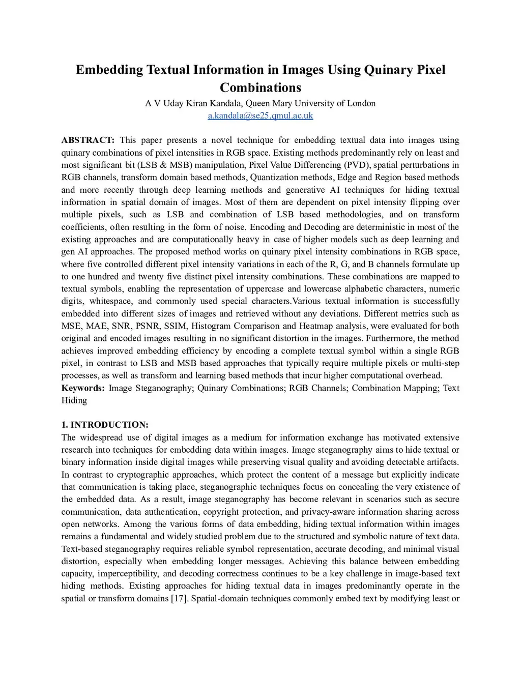 This paper presents a novel technique for embedding textual data into images using quinary combinations of pixel intensities in RGB space. Existing methods predominantly rely on least and most significant bit (LSB & MSB) manipulation, Pixel Value Differencing (PVD), spatial perturbations in RGB channels, transform domain based methods, Quantization methods, Edge and Region based methods and more recently through deep learning methods and generative AI techniques for hiding textual information in spatial domain of images. Most of them are dependent on pixel intensity flipping over multiple pixels, such as LSB and combination of LSB based methodologies, and on transform coefficients, often resulting in the form of noise. Encoding and Decoding are deterministic in most of the existing approaches and are computationally heavy in case of higher models such as deep learning and gen AI approaches. The proposed method works on quinary pixel intensity combinations in RGB space, where five controlled different pixel intensity variations in each of the R, G, and B channels formulate up to one hundred and twenty five distinct pixel intensity combinations. These combinations are mapped to textual symbols, enabling the representation of uppercase and lowercase alphabetic characters, numeric digits, whitespace, and commonly used special characters. Different metrics such as MSE, MAE, SNR, PSNR, SSIM, Histogram Comparison and Heatmap analysis, were evaluated for both original and encoded images resulting in no significant distortion in the images. Furthermore, the method achieves improved embedding efficiency by encoding a complete textual symbol within a single RGB pixel, in contrast to LSB and MSB based approaches that typically require multiple pixels or multi-step processes, as well as transform and learning based methods that incur higher computational overhead.