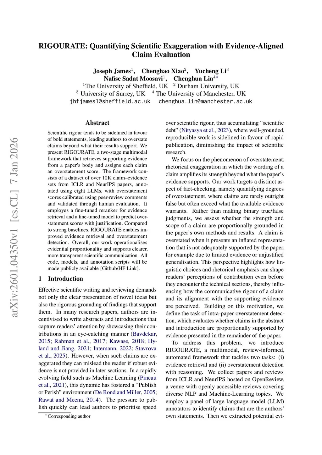 Scientific rigour tends to be sidelined in favour of bold statements, leading authors to overstate claims beyond what their results support. We present RIGOURATE, a two-stage multimodal framework that retrieves supporting evidence from a paper's body and assigns each claim an overstatement score. The framework consists of a dataset of over 10K claim-evidence sets from ICLR and NeurIPS papers, annotated using eight LLMs, with overstatement scores calibrated using peer-review comments and validated through human evaluation. It employes a fine-tuned reranker for evidence retrieval and a fine-tuned model to predict overstatement scores with justification. Compared to strong baselines, RIGOURATE enables improved evidence retrieval and overstatement detection. Overall, our work operationalises evidential proportionality and supports clearer, more transparent scientific communication.
