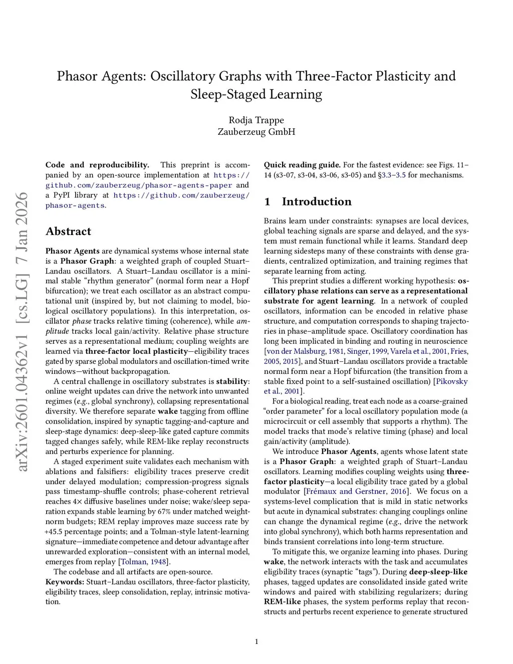Phasor Agents are dynamical systems whose internal state is a Phasor Graph: a weighted graph of coupled Stuart-Landau oscillators. A Stuart-Landau oscillator is a minimal stable "rhythm generator" (the normal form near a Hopf bifurcation); each oscillator is treated as an abstract computational unit (inspired by, but not claiming to model, biological oscillatory populations). In this interpretation, oscillator phase tracks relative timing (coherence), while amplitude tracks local gain or activity. Relative phase structure serves as a representational medium; coupling weights are learned via three-factor local plasticity - eligibility traces gated by sparse global modulators and oscillation-timed write windows - without backpropagation.A central challenge in oscillatory substrates is stability: online weight updates can drive the network into unwanted regimes (e.g., global synchrony), collapsing representational diversity. We therefore separate wake tagging from offline consolidation, inspired by synaptic tagging-and-capture and sleep-stage dynamics: deep-sleep-like gated capture commits tagged changes safely, while REM-like replay reconstructs and perturbs experience for planning.A staged experiment suite validates each mechanism with ablations and falsifiers: eligibility traces preserve credit under delayed modulation; compression-progress signals pass timestamp-shuffle controls; phase-coherent retrieval reaches 4x diffusive baselines under noise; wake/sleep separation expands stable learning by 67 percent under matched weight-norm budgets; REM replay improves maze success rate by +45.5 percentage points; and a Tolman-style latent-learning signature - immediate competence and detour advantage after unrewarded exploration, consistent with an internal model - emerges from replay (Tolman, 1948).The codebase and all artifacts are open-source.