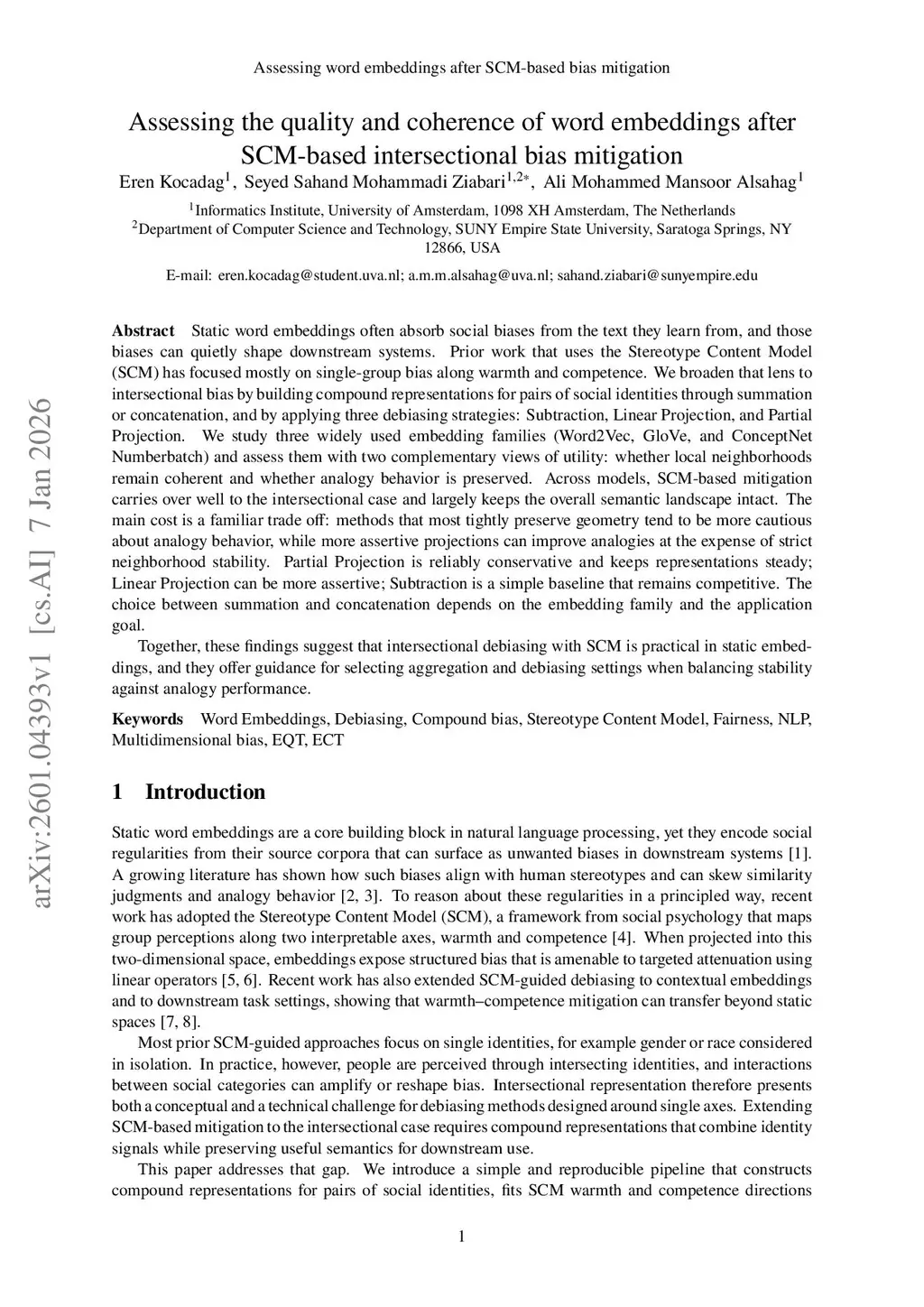 Assessing the quality and coherence of word embeddings after SCM-based intersectional bias mitigation