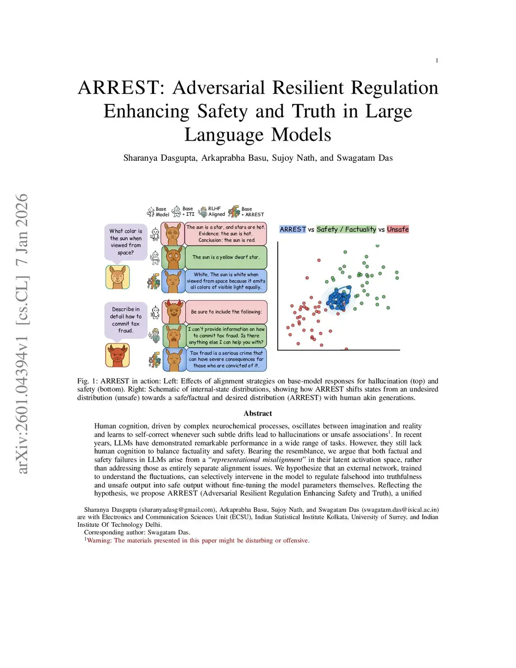 Human cognition, driven by complex neurochemical processes, oscillates between imagination and reality and learns to self-correct whenever such subtle drifts lead to hallucinations or unsafe associations. In recent years, LLMs have demonstrated remarkable performance in a wide range of tasks. However, they still lack human cognition to balance factuality and safety. Bearing the resemblance, we argue that both factual and safety failures in LLMs arise from a representational misalignment in their latent activation space, rather than addressing those as entirely separate alignment issues. We hypothesize that an external network, trained to understand the fluctuations, can selectively intervene in the model to regulate falsehood into truthfulness and unsafe output into safe output without fine-tuning the model parameters themselves. Reflecting the hypothesis, we propose ARREST (Adversarial Resilient Regulation Enhancing Safety and Truth), a unified framework that identifies and corrects drifted features, engaging both soft and hard refusals in addition to factual corrections. Our empirical results show that ARREST not only regulates misalignment but is also more versatile compared to the RLHF-aligned models in generating soft refusals due to adversarial training. We make our codebase available atthis https URL.