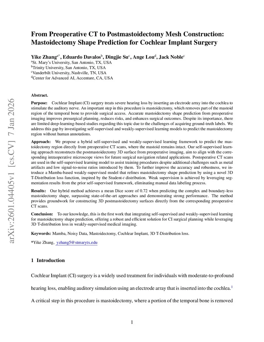 Cochlear Implant (CI) surgery treats severe hearing loss by inserting an electrode array into the cochlea to stimulate the auditory nerve. An important step in this procedure is mastoidectomy, which removes part of the mastoid region of the temporal bone to provide surgical access. Accurate mastoidectomy shape prediction from preoperative imaging improves pre-surgical planning, reduces risks, and enhances surgical outcomes. Despite its importance, there are limited deep-learning-based studies regarding this topic due to the challenges of acquiring ground-truth labels. We address this gap by investigating self-supervised and weakly-supervised learning models to predict the mastoidectomy region without human annotations. We propose a hybrid self-supervised and weakly-supervised learning framework to predict the mastoidectomy region directly from preoperative CT scans, where the mastoid remains intact. Our hybrid method achieves a mean Dice score of 0.72 when predicting the complex and boundary-less mastoidectomy shape, surpassing state-of-the-art approaches and demonstrating strong performance. The method provides groundwork for constructing 3D postmastoidectomy surfaces directly from the corresponding preoperative CT scans. To our knowledge, this is the first work that integrating self-supervised and weakly-supervised learning for mastoidectomy shape prediction, offering a robust and efficient solution for CI surgical planning while leveraging 3D T-distribution loss in weakly-supervised medical imaging.