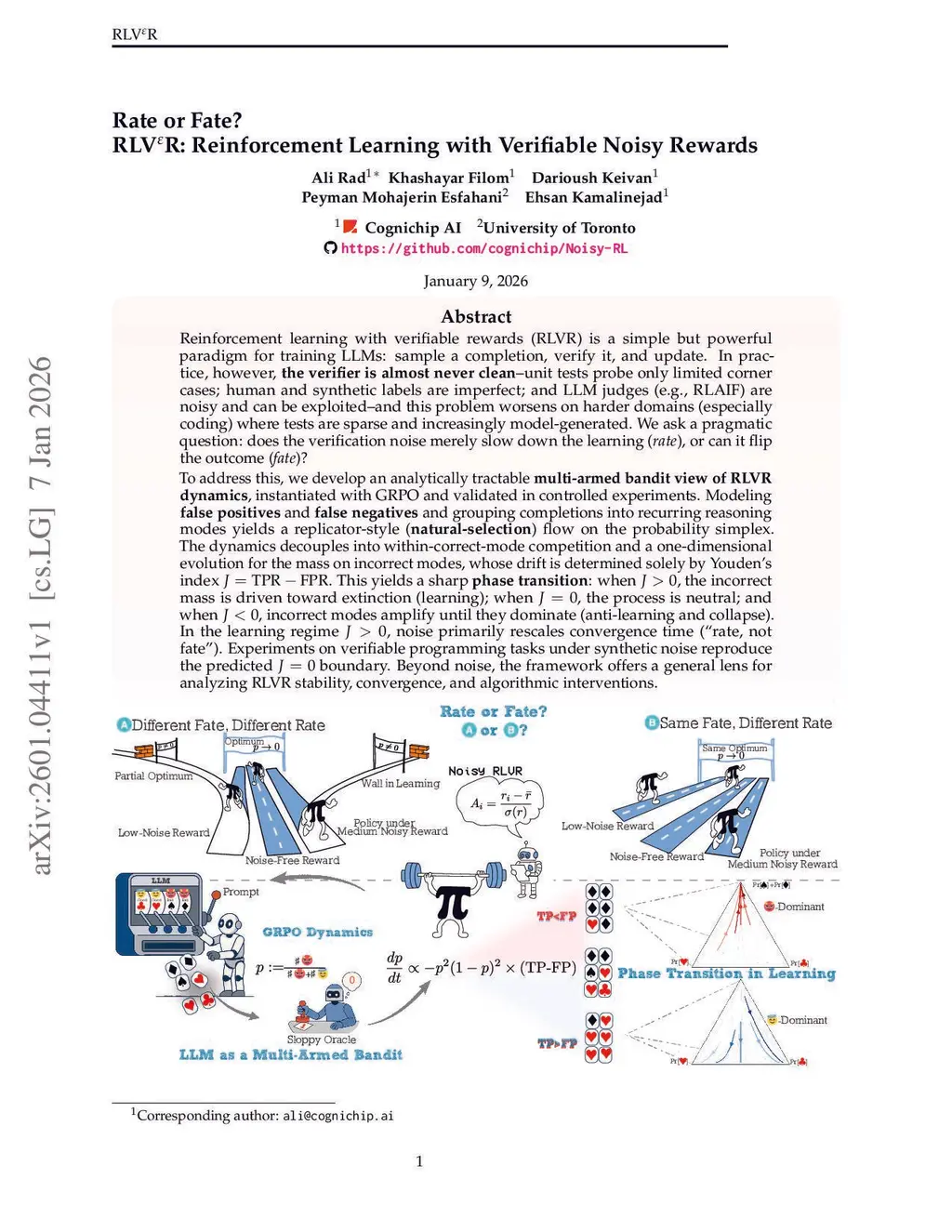 Reinforcement learning with verifiable rewards (RLVR) is a simple but powerful paradigm for training LLMs: sample a completion, verify it, and update. In practice, however, the verifier is almost never clean--unit tests probe only limited corner cases; human and synthetic labels are imperfect; and LLM judges (e.g., RLAIF) are noisy and can be exploited--and this problem worsens on harder domains (especially coding) where tests are sparse and increasingly model-generated. We ask a pragmatic question: does the verification noise merely slow down the learning (rate), or can it flip the outcome (fate)?To address this, we develop an analytically tractable multi-armed bandit view of RLVR dynamics, instantiated with GRPO and validated in controlled experiments. Modeling false positives and false negatives and grouping completions into recurring reasoning modes yields a replicator-style (natural-selection) flow on the probability simplex. The dynamics decouples into within-correct-mode competition and a one-dimensional evolution for the mass on incorrect modes, whose drift is determined solely by Youden's index J=TPR-FPR. This yields a sharp phase transition: when J>0, the incorrect mass is driven toward extinction (learning); when J=0, the process is neutral; and when J<0, incorrect modes amplify until they dominate (anti-learning and collapse). In the learning regime J>0, noise primarily rescales convergence time ("rate, not fate"). Experiments on verifiable programming tasks under synthetic noise reproduce the predicted J=0 boundary. Beyond noise, the framework offers a general lens for analyzing RLVR stability, convergence, and algorithmic interventions.