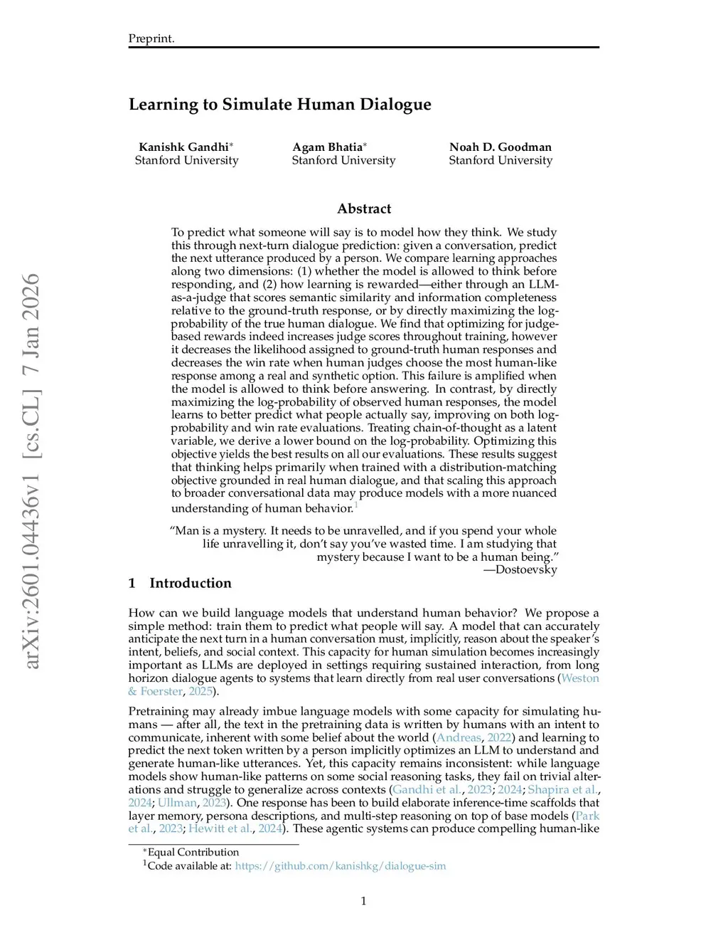 To predict what someone will say is to model how they think. We study this through next-turn dialogue prediction: given a conversation, predict the next utterance produced by a person. We compare learning approaches along two dimensions: (1) whether the model is allowed to think before responding, and (2) how learning is rewarded either through an LLM-as-a-judge that scores semantic similarity and information completeness relative to the ground-truth response, or by directly maximizing the log-probability of the true human dialogue. We find that optimizing for judge-based rewards indeed increases judge scores throughout training, however it decreases the likelihood assigned to ground truth human responses and decreases the win rate when human judges choose the most human-like response among a real and synthetic option. This failure is amplified when the model is allowed to think before answering. In contrast, by directly maximizing the log-probability of observed human responses, the model learns to better predict what people actually say, improving on both log-probability and win rate evaluations. Treating chain-of-thought as a latent variable, we derive a lower bound on the log-probability. Optimizing this objective yields the best results on all our evaluations. These results suggest that thinking helps primarily when trained with a distribution-matching objective grounded in real human dialogue, and that scaling this approach to broader conversational data may produce models with a more nuanced understanding of human behavior.