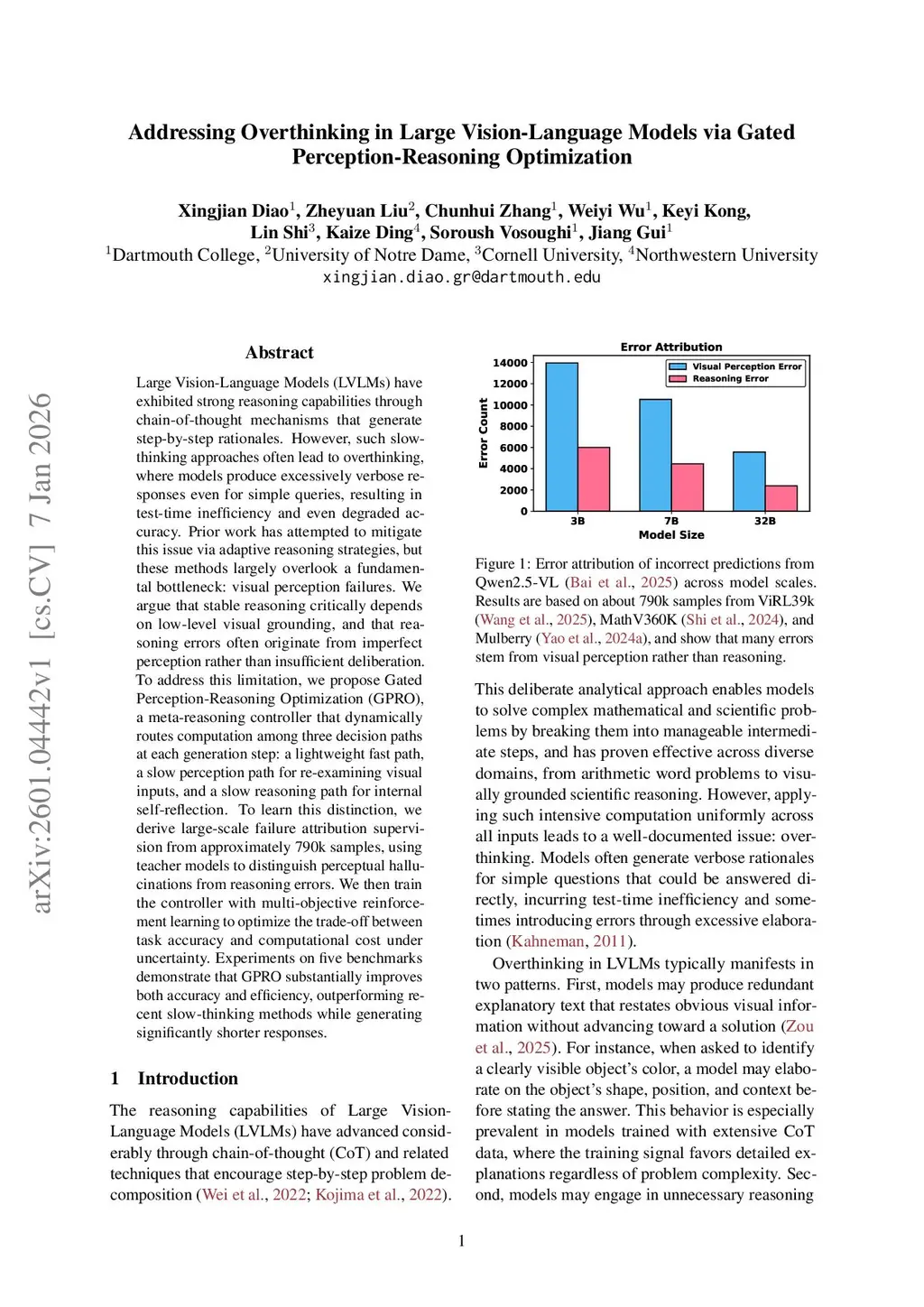 Large Vision-Language Models (LVLMs) have exhibited strong reasoning capabilities through chain-of-thought mechanisms that generate step-by-step rationales. However, such slow-thinking approaches often lead to overthinking, where models produce excessively verbose responses even for simple queries, resulting in test-time inefficiency and even degraded accuracy. Prior work has attempted to mitigate this issue via adaptive reasoning strategies, but these methods largely overlook a fundamental bottleneck: visual perception failures. We argue that stable reasoning critically depends on low-level visual grounding, and that reasoning errors often originate from imperfect perception rather than insufficient deliberation. To address this limitation, we propose Gated Perception-Reasoning Optimization (GPRO), a meta-reasoning controller that dynamically routes computation among three decision paths at each generation step: a lightweight fast path, a slow perception path for re-examining visual inputs, and a slow reasoning path for internal self-reflection. To learn this distinction, we derive large-scale failure attribution supervision from approximately 790k samples, using teacher models to distinguish perceptual hallucinations from reasoning errors. We then train the controller with multi-objective reinforcement learning to optimize the trade-off between task accuracy and computational cost under uncertainty. Experiments on five benchmarks demonstrate that GPRO substantially improves both accuracy and efficiency, outperforming recent slow-thinking methods while generating significantly shorter responses.