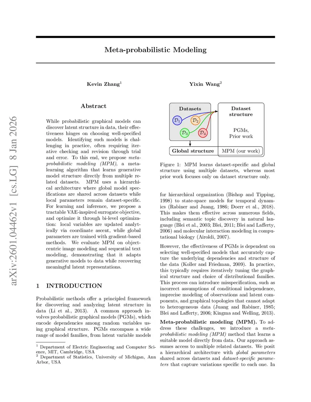 Probabilistic graphical models (PGMs) are widely used to discover latent structure in data, but their success hinges on selecting an appropriate model design. In practice, model specification is difficult and often requires iterative trial-and-error. This challenge arises because classical PGMs typically operate on individual datasets. In this work, we consider settings involving collections of related datasets and propose meta-probabilistic modeling (MPM) to learn the generative model structure itself. MPM uses a hierarchical formulation in which global components encode shared patterns across datasets, while local parameters capture dataset-specific latent structure. For scalable learning and inference, we derive a tractable VAE-inspired surrogate objective together with a bi-level optimization algorithm. Our methodology supports a broad class of expressive probabilistic models and has connections to existing architectures, such as Slot Attention. Experiments on object-centric representation learning and sequential text modeling demonstrate that MPM effectively adapts generative models to data while recovering meaningful latent representations.