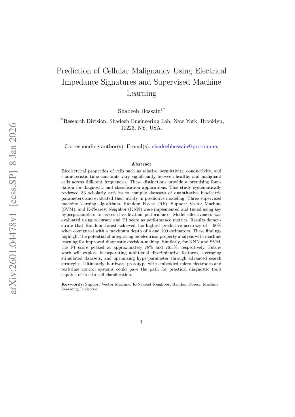 Prediction of Cellular Malignancy Using Electrical Impedance Signatures and Supervised Machine Learning