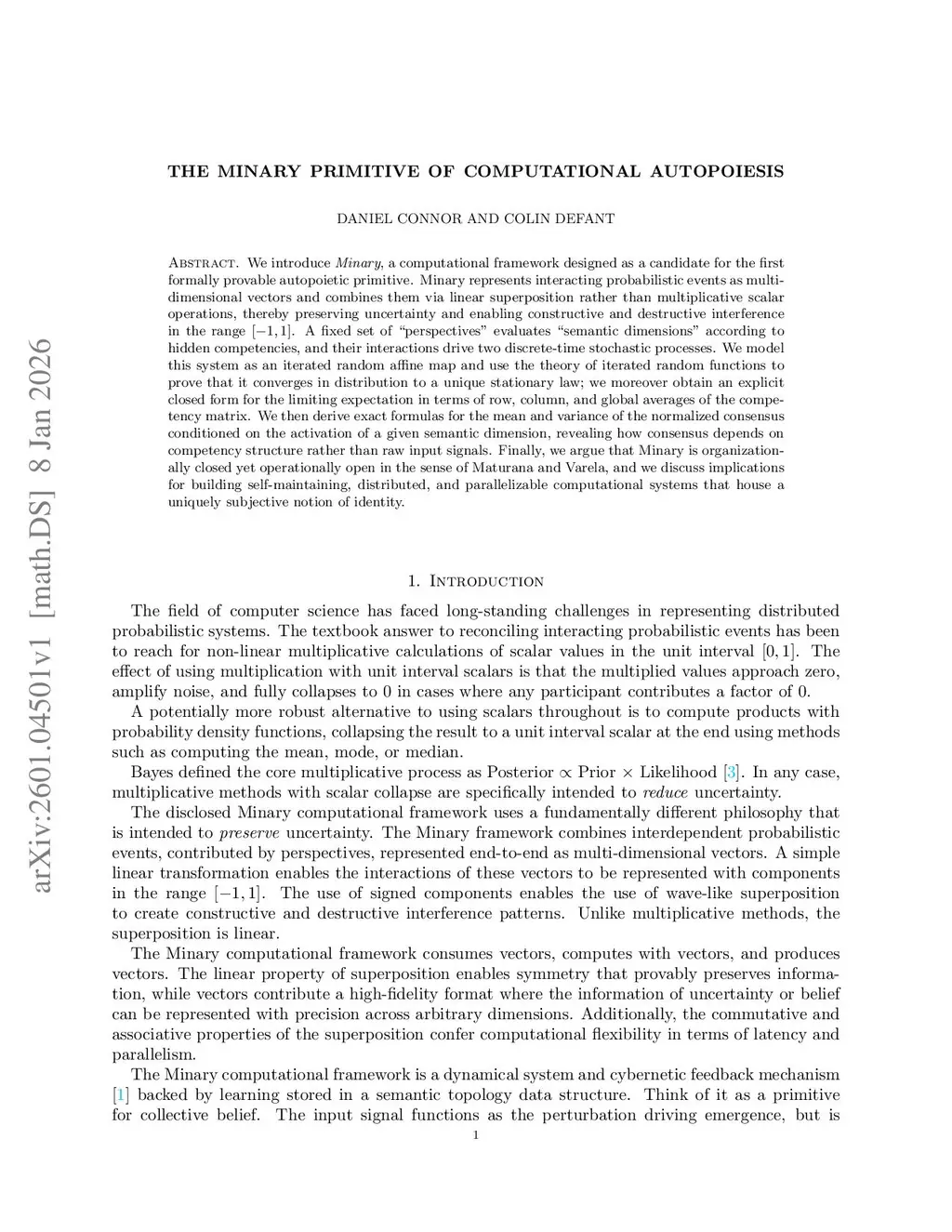 We introduce Minary, a computational framework designed as a candidate for the first formally provable autopoietic primitive. Minary represents interacting probabilistic events as multi-dimensional vectors and combines them via linear superposition rather than multiplicative scalar operations, thereby preserving uncertainty and enabling constructive and destructive interference in the range . A fixed set of ``perspectives'' evaluates ``semantic dimensions'' according to hidden competencies, and their interactions drive two discrete-time stochastic processes. We model this system as an iterated random affine map and use the theory of iterated random functions to prove that it converges in distribution to a unique stationary law; we moreover obtain an explicit closed form for the limiting expectation in terms of row, column, and global averages of the competency matrix. We then derive exact formulas for the mean and variance of the normalized consensus conditioned on the activation of a given semantic dimension, revealing how consensus depends on competency structure rather than raw input signals. Finally, we argue that Minary is organizationally closed yet operationally open in the sense of Maturana and Varela, and we discuss implications for building self-maintaining, distributed, and parallelizable computational systems that house a uniquely subjective notion of identity.
