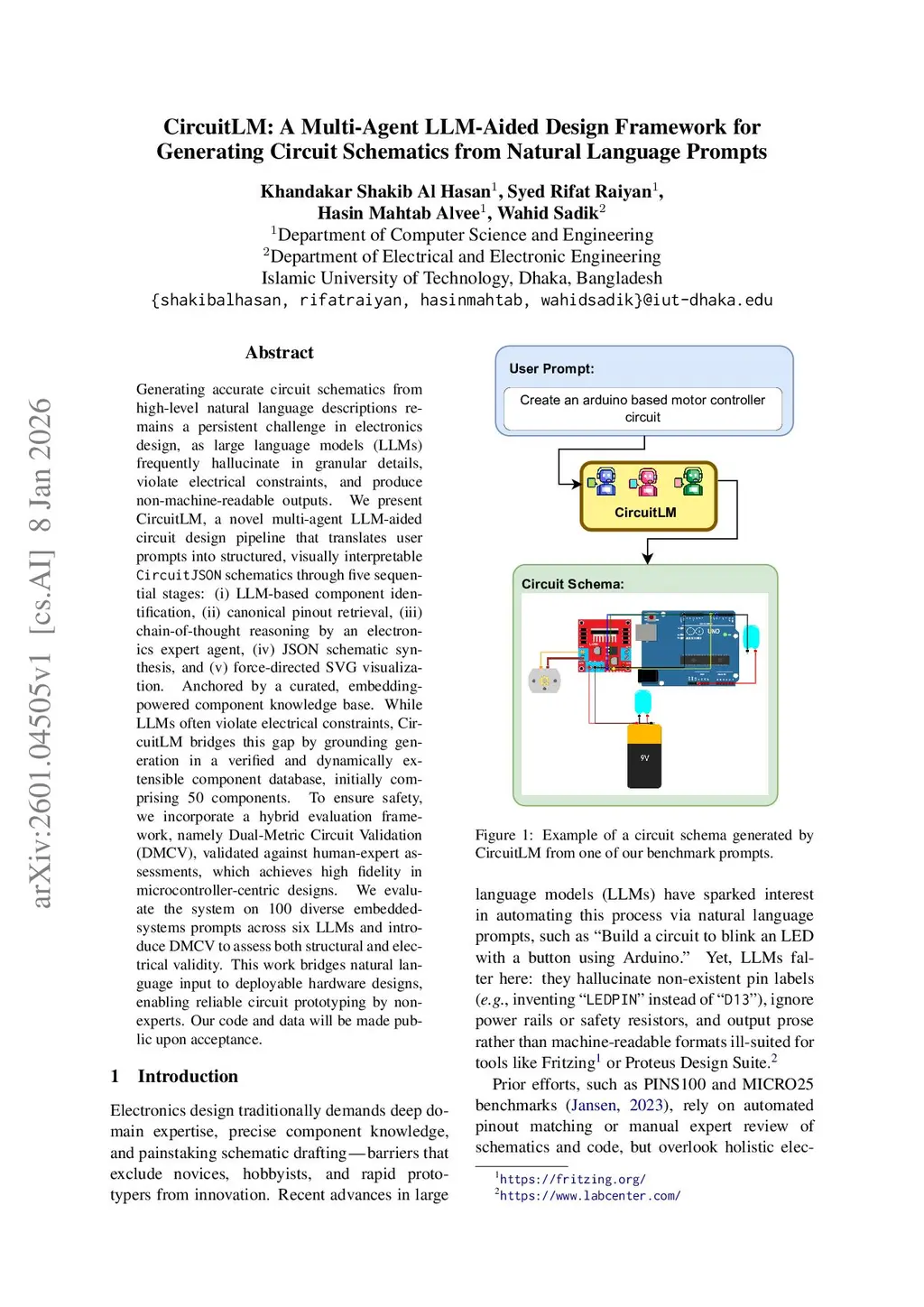 Generating accurate circuit schematics from high-level natural language descriptions remains a persistent challenge in electronic design automation (EDA), as large language models (LLMs) frequently hallucinate components, violate strict physical constraints, and produce non-machine-readable outputs. To address this, we present CircuitLM, a multi-agent pipeline that translates user prompts into structured, visually interpretable schematics. The framework mitigates hallucination and ensures physical viability by grounding generation in a curated, embedding-powered component knowledge base through five sequential stages: (i) component identification, (ii) canonical pinout retrieval, (iii) chain-of-thought reasoning, (iv) JSON schematic synthesis, and (v) interactive force-directed visualization. We evaluate the system on a dataset of 100 unique circuit-design prompts using five state-of-the-art LLMs. To systematically assess performance, we deploy a rigorous dual-layered evaluation methodology: a deterministic Electrical Rule Checking (ERC) engine categorizes topological faults by strict severity (Critical, Major, Minor, Warning), while an LLM-as-a-judge meta-evaluator identifies complex, context-aware design flaws that bypass standard rule-based checkers. Ultimately, this work demonstrates how targeted retrieval combined with deterministic and semantic verification can bridge natural language to structurally viable, schematic-ready hardware and safe circuit prototyping. Our code and data will be made public.