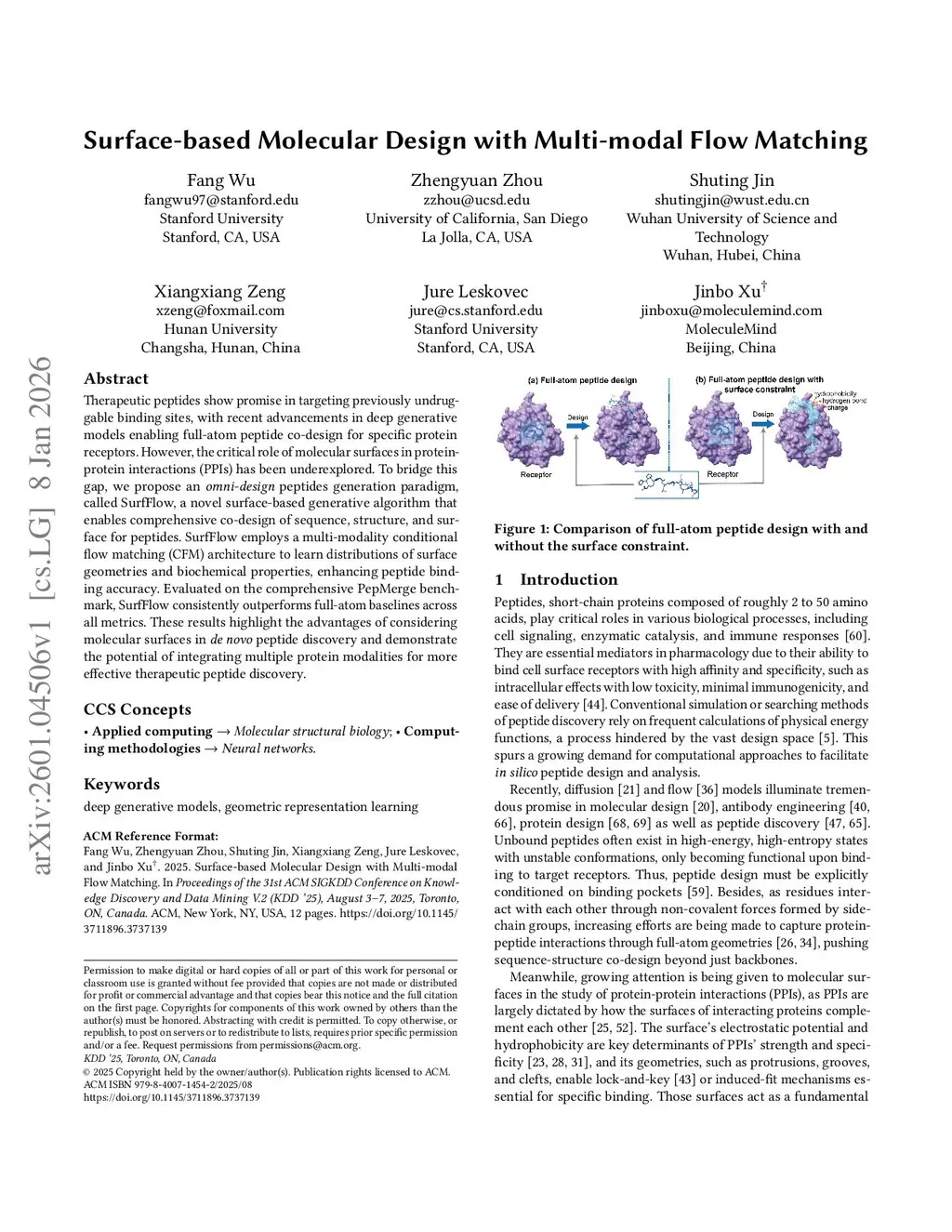 Therapeutic peptides show promise in targeting previously undruggable binding sites, with recent advancements in deep generative models enabling full-atom peptide co-design for specific protein receptors. However, the critical role of molecular surfaces in protein-protein interactions (PPIs) has been underexplored. To bridge this gap, we propose an omni-design peptides generation paradigm, called SurfFlow, a novel surface-based generative algorithm that enables comprehensive co-design of sequence, structure, and surface for peptides. SurfFlow employs a multi-modality conditional flow matching (CFM) architecture to learn distributions of surface geometries and biochemical properties, enhancing peptide binding accuracy. Evaluated on the comprehensive PepMerge benchmark, SurfFlow consistently outperforms full-atom baselines across all metrics. These results highlight the advantages of considering molecular surfaces in de novo peptide discovery and demonstrate the potential of integrating multiple protein modalities for more effective therapeutic peptide discovery.