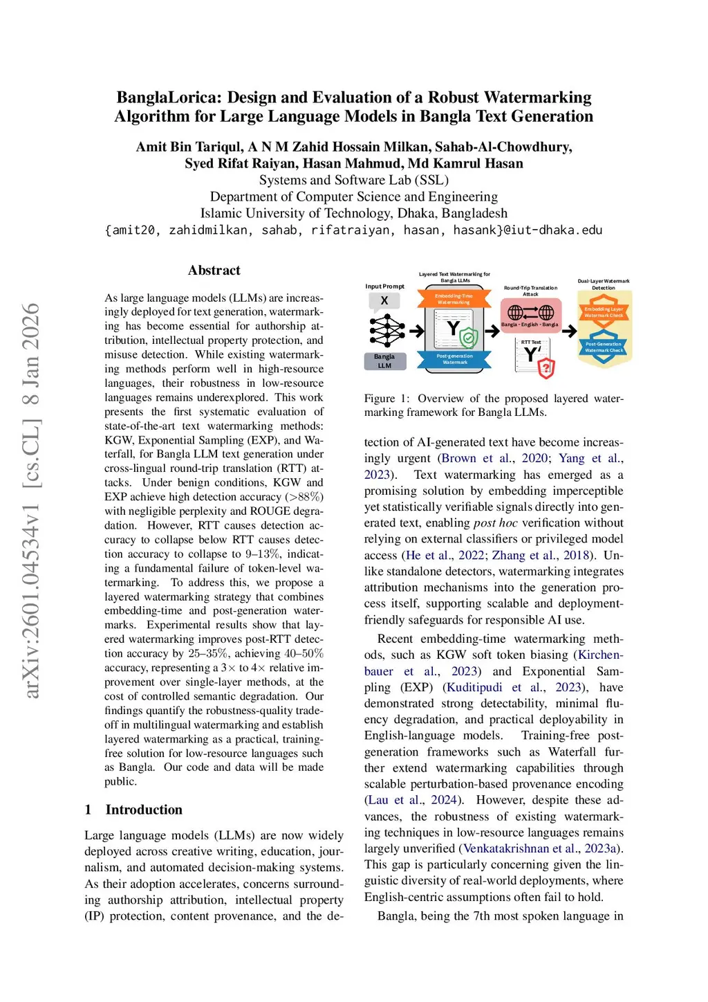 As large language models (LLMs) are increasingly deployed for text generation, watermarking has become essential for authorship attribution, intellectual property protection, and misuse detection. While existing watermarking methods perform well in high-resource languages, their robustness in low-resource languages remains underexplored. This work presents the first systematic evaluation of state-of-the-art text watermarking methods: KGW, Exponential Sampling (EXP), and Waterfall, for Bangla LLM text generation under cross-lingual round-trip translation (RTT) attacks. Under benign conditions, KGW and EXP achieve high detection accuracy (>88%) with negligible perplexity and ROUGE degradation. However, RTT causes detection accuracy to collapse below RTT causes detection accuracy to collapse to 9-13%, indicating a fundamental failure of token-level watermarking. To address this, we propose a layered watermarking strategy that combines embedding-time and post-generation watermarks. Experimental results show that layered watermarking improves post-RTT detection accuracy by 25-35%, achieving 40-50% accuracy, representing a 3 to 4 relative improvement over single-layer methods, at the cost of controlled semantic degradation. Our findings quantify the robustness-quality trade-off in multilingual watermarking and establish layered watermarking as a practical, training-free solution for low-resource languages such as Bangla. Our code and data will be made public.