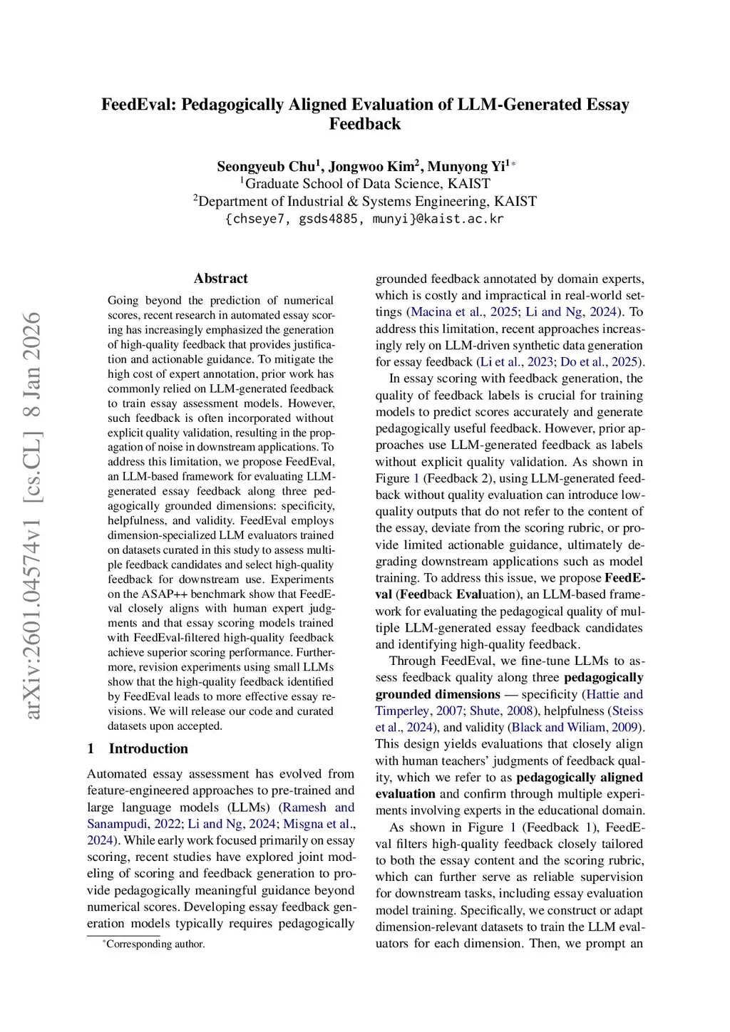 Going beyond the prediction of numerical scores, recent research in automated essay scoring has increasingly emphasized the generation of high-quality feedback that provides justification and actionable guidance. To mitigate the high cost of expert annotation, prior work has commonly relied on LLM-generated feedback to train essay assessment models. However, such feedback is often incorporated without explicit quality validation, resulting in the propagation of noise in downstream applications. To address this limitation, we propose FeedEval, an LLM-based framework for evaluating LLM-generated essay feedback along three pedagogically grounded dimensions: specificity, helpfulness, and validity. FeedEval employs dimension-specialized LLM evaluators trained on datasets curated in this study to assess multiple feedback candidates and select high-quality feedback for downstream use. Experiments on the ASAP++ benchmark show that FeedEval closely aligns with human expert judgments and that essay scoring models trained with FeedEval-filtered high-quality feedback achieve superior scoring performance. Furthermore, revision experiments using small LLMs show that the high-quality feedback identified by FeedEval leads to more effective essay revisions. We will release our code and curated datasets upon accepted.