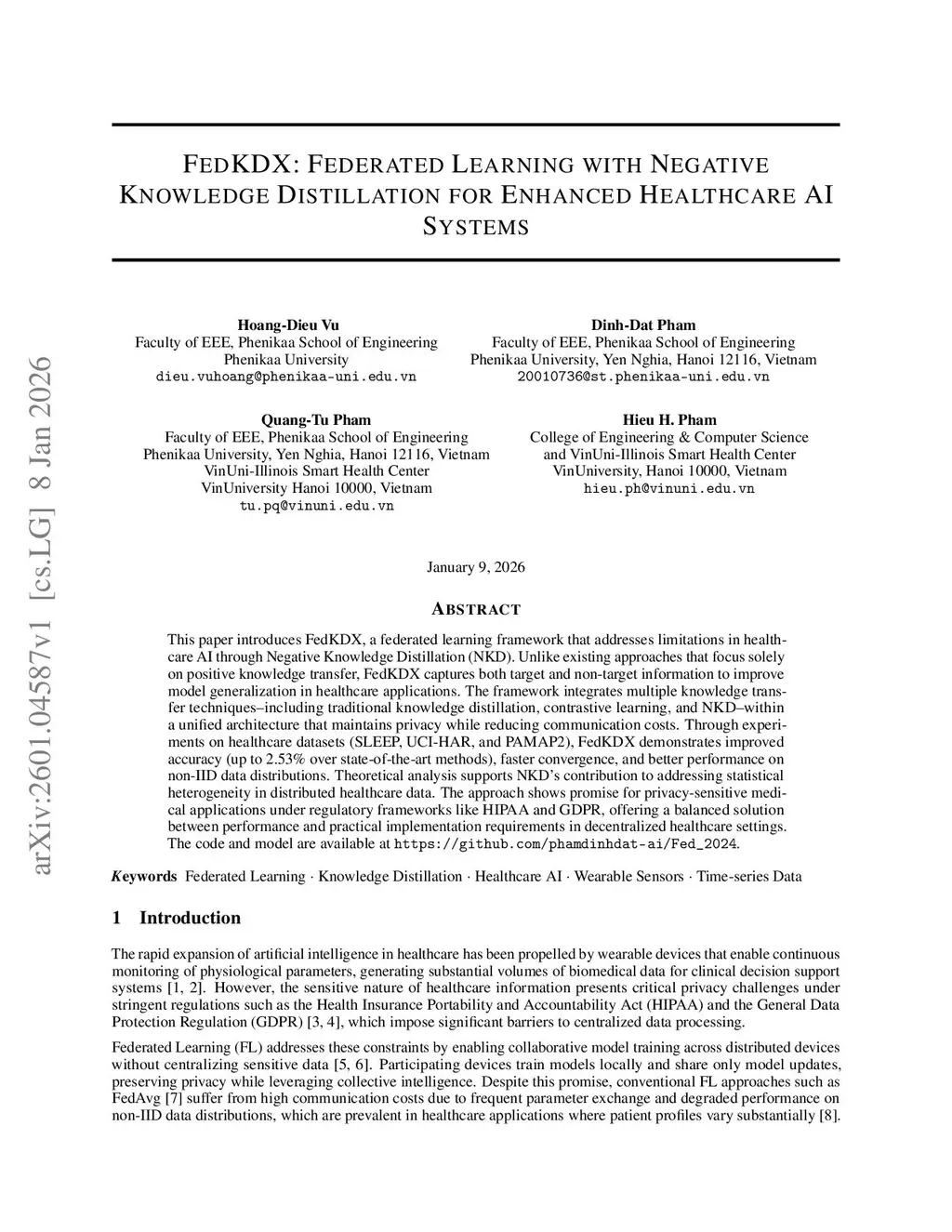 This paper introduces FedKDX, a federated learning framework that addresses limitations in healthcare AI through Negative Knowledge Distillation (NKD). Unlike existing approaches that focus solely on positive knowledge transfer, FedKDX captures both target and non-target information to improve model generalization in healthcare applications. The framework integrates multiple knowledge transfer techniques--including traditional knowledge distillation, contrastive learning, and NKD--within a unified architecture that maintains privacy while reducing communication costs. Through experiments on healthcare datasets (SLEEP, UCI-HAR, and PAMAP2), FedKDX demonstrates improved accuracy (up to 2.53% over state-of-the-art methods), faster convergence, and better performance on non-IID data distributions. Theoretical analysis supports NKD's contribution to addressing statistical heterogeneity in distributed healthcare data. The approach shows promise for privacy-sensitive medical applications under regulatory frameworks like HIPAA and GDPR, offering a balanced solution between performance and practical implementation requirements in decentralized healthcare settings. The code and model are available atthis https URL.