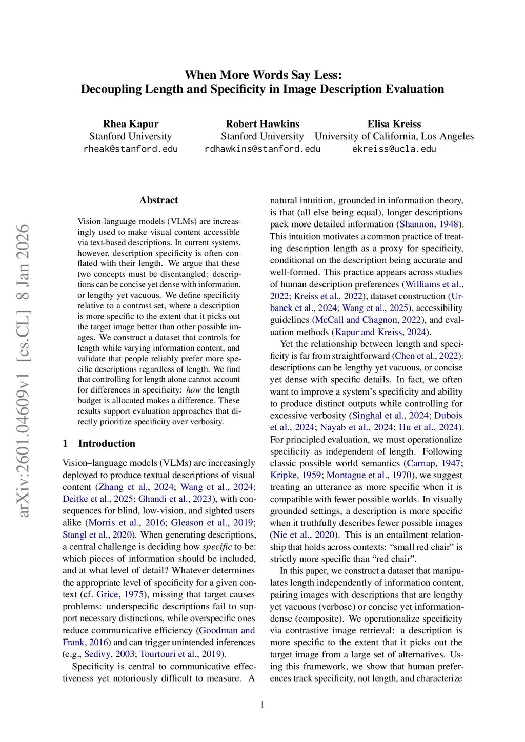 When More Words Say Less: Decoupling Length and Specificity in Image Description Evaluation