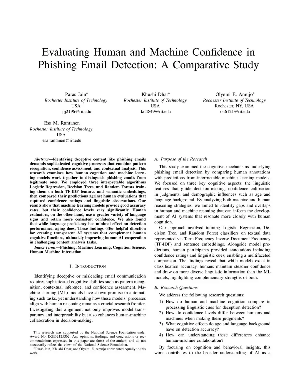Identifying deceptive content like phishing emails demands sophisticated cognitive processes that combine pattern recognition, confidence assessment, and contextual analysis. This research examines how human cognition and machine learn- ing models work together to distinguish phishing emails from legitimate ones. We employed three interpretable algorithms Logistic Regression, Decision Trees, and Random Forests train- ing them on both TF-IDF features and semantic embeddings, then compared their predictions against human evaluations that captured confidence ratings and linguistic observations. Our results show that machine learning models provide good accuracy rates, but their confidence levels vary significantly. Human evaluators, on the other hand, use a greater variety of language signs and retain more consistent confidence. We also found that while language proficiency has minimal effect on detection performance, aging does. These findings offer helpful direction for creating transparent AI systems that complement human cognitive functions, ultimately improving human-AI cooperation in challenging content analysis tasks.
