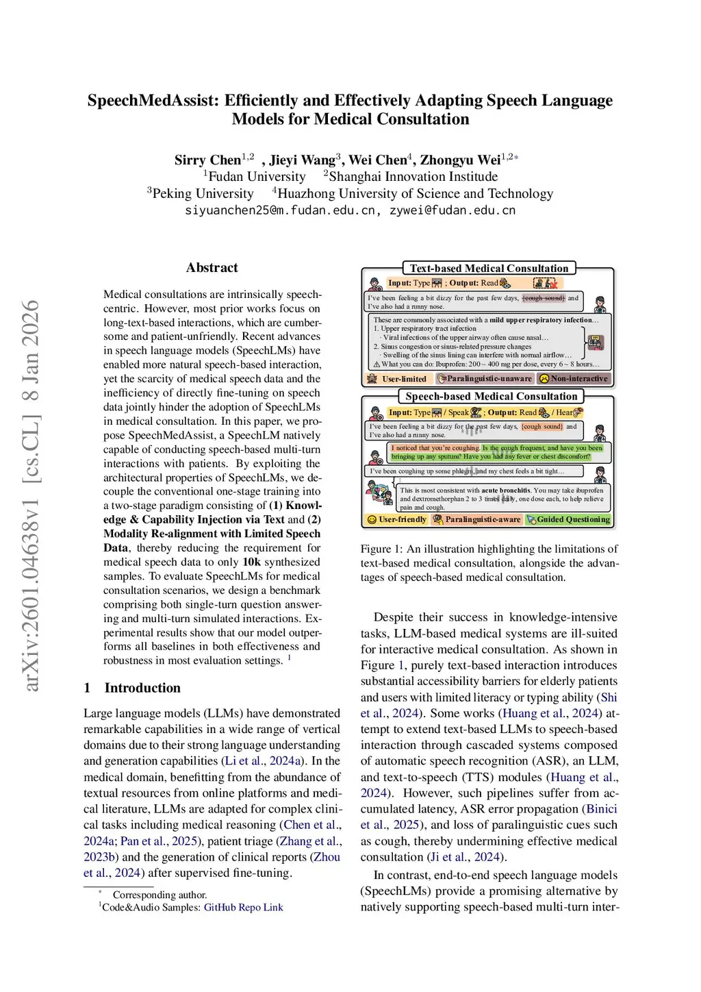 Medical consultations are intrinsically speech-centric. However, most prior works focus on long-text-based interactions, which are cumbersome and patient-unfriendly. Recent advances in speech language models (SpeechLMs) have enabled more natural speech-based interaction, yet the scarcity of medical speech data and the inefficiency of directly fine-tuning on speech data jointly hinder the adoption of SpeechLMs in medical consultation. In this paper, we propose SpeechMedAssist, a SpeechLM natively capable of conducting speech-based multi-turn interactions with patients. By exploiting the architectural properties of SpeechLMs, we decouple the conventional one-stage training into a two-stage paradigm consisting of (1) Knowledge & Capability Injection via Text and (2) Modality Re-alignment with Limited Speech Data, thereby reducing the requirement for medical speech data to only 10k synthesized samples. To evaluate SpeechLMs for medical consultation scenarios, we design a benchmark comprising both single-turn question answering and multi-turn simulated interactions. Experimental results show that our model outperforms all baselines in both effectiveness and robustness in most evaluation settings.