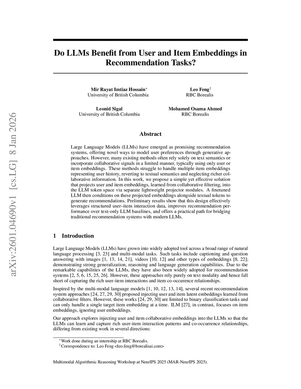 Do LLMs Benefit from User and Item Embeddings in Recommendation Tasks?