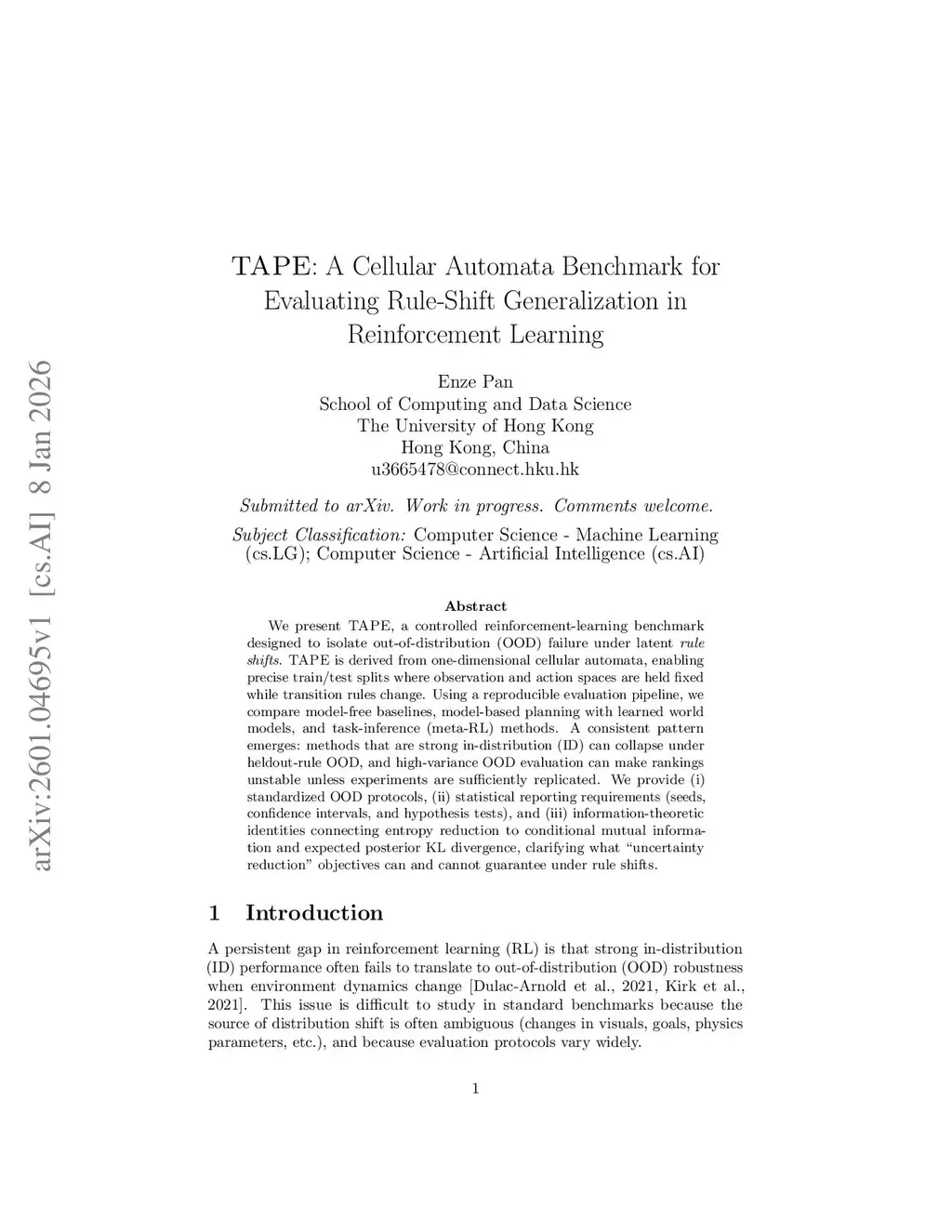 We present Tape, a controlled reinforcement-learning benchmark designed to isolate out-of-distribution (OOD) failure under latent rulethis http URLis derived from one-dimensional cellular automata, enabling precise train/test splits where observation and action spaces are held fixed while transition rules change. Using a reproducible evaluation pipeline, we compare model-free baselines, model-based planning with learned world models, and task-inference (meta-RL) methods. A consistent pattern emerges: methods that are strong in-distribution (ID) can collapse under heldout-rule OOD, and high-variance OOD evaluation can make rankings unstable unless experiments are sufficientlythis http URLprovide (i) standardized OOD protocols, (ii) statistical reporting requirements (seeds, confidence intervals, and hypothesis tests), and (iii) information-theoretic identities connecting entropy reduction to conditional mutual information and expected posterior KL divergence, clarifying what "uncertainty reduction" objectives can and cannot guarantee under rule shifts.