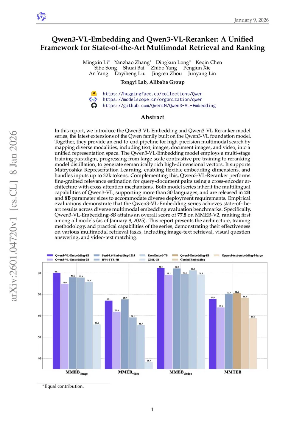 In this report, we introduce the Qwen3-VL-Embedding and Qwen3-VL-Reranker model series, the latest extensions of the Qwen family built on the Qwen3-VL foundation model. Together, they provide an end-to-end pipeline for high-precision multimodal search by mapping diverse modalities, including text, images, document images, and video, into a unified representation space. The Qwen3-VL-Embedding model employs a multi-stage training paradigm, progressing from large-scale contrastive pre-training to reranking model distillation, to generate semantically rich high-dimensional vectors. It supports Matryoshka Representation Learning, enabling flexible embedding dimensions, and handles inputs up to 32k tokens. Complementing this, Qwen3-VL-Reranker performs fine-grained relevance estimation for query-document pairs using a cross-encoder architecture with cross-attention mechanisms. Both model series inherit the multilingual capabilities of Qwen3-VL, supporting more than 30 languages, and are released in and parameter sizes to accommodate diverse deployment requirements. Empirical evaluations demonstrate that the Qwen3-VL-Embedding series achieves state-of-the-art results across diverse multimodal embedding evaluation benchmarks. Specifically, Qwen3-VL-Embedding-8B attains an overall score of on MMEB-V2, ranking first among all models (as of January 8, 2025). This report presents the architecture, training methodology, and practical capabilities of the series, demonstrating their effectiveness on various multimodal retrieval tasks, including image-text retrieval, visual question answering, and video-text matching.