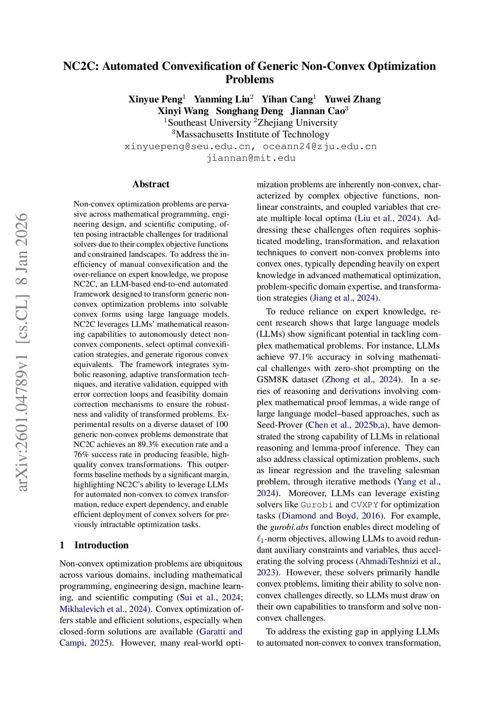 Non-convex optimization problems are pervasive across mathematical programming, engineering design, and scientific computing, often posing intractable challenges for traditional solvers due to their complex objective functions and constrained landscapes. To address the inefficiency of manual convexification and the over-reliance on expert knowledge, we propose NC2C, an LLM-based end-to-end automated framework designed to transform generic non-convex optimization problems into solvable convex forms using large language models. NC2C leverages LLMs' mathematical reasoning capabilities to autonomously detect non-convex components, select optimal convexification strategies, and generate rigorous convex equivalents. The framework integrates symbolic reasoning, adaptive transformation techniques, and iterative validation, equipped with error correction loops and feasibility domain correction mechanisms to ensure the robustness and validity of transformed problems. Experimental results on a diverse dataset of 100 generic non-convex problems demonstrate that NC2C achieves an 89.3\% execution rate and a 76\% success rate in producing feasible, high-quality convex transformations. This outperforms baseline methods by a significant margin, highlighting NC2C's ability to leverage LLMs for automated non-convex to convex transformation, reduce expert dependency, and enable efficient deployment of convex solvers for previously intractable optimization tasks.
